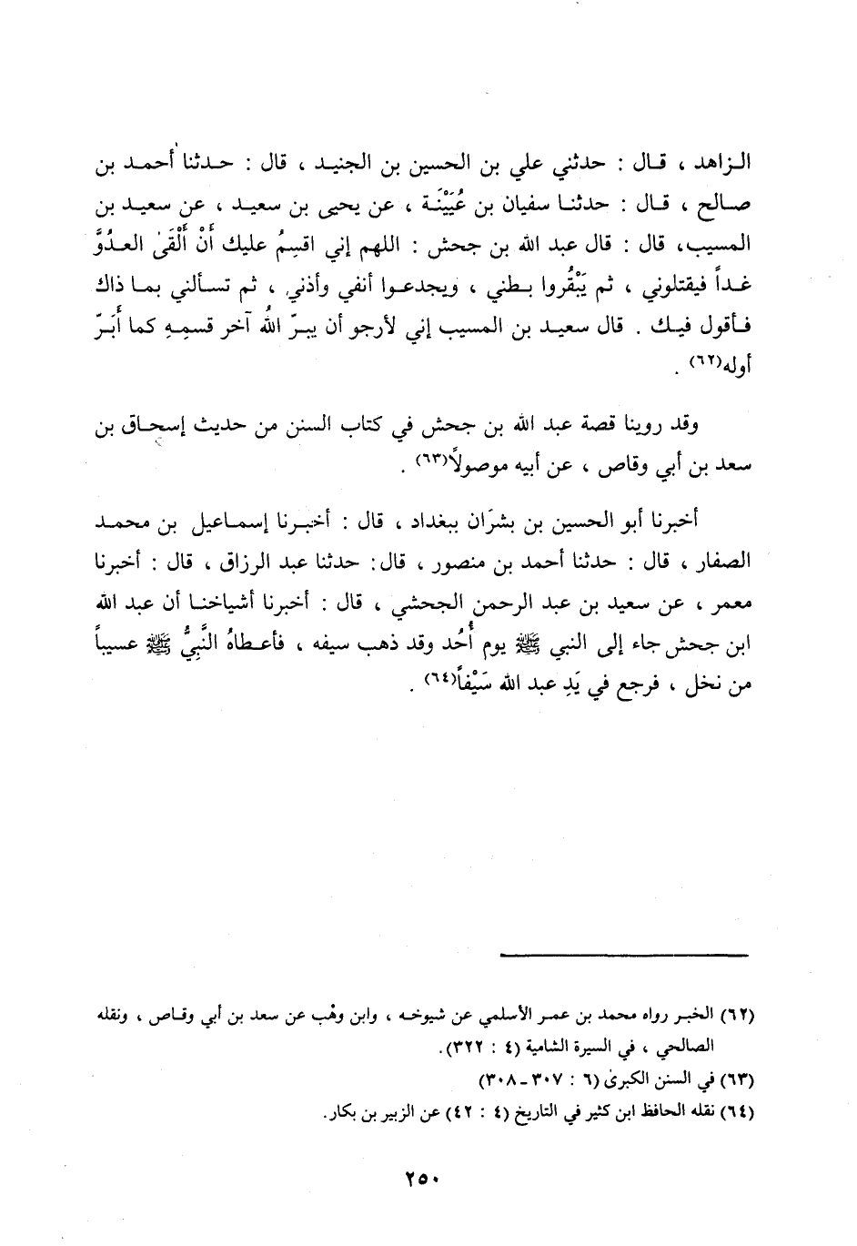 الزَّاهِدُ، قَالَ: حَدَّثَنِي عَلِيُّ بْنُ الْحُسَيْنِ بْنِ الْجُنَيْدِ، قَالَ: حَدَّثَنَا أَحْمَدُ بْنُ صَالِحٍ، قَالَ: حَدَّثَنَا سُفْيَانُ بْنُ عُيَيْنَةَ، عَنْ يَحْيَى بْنِ سَعِيدٍ، عَنْ سَعِيدِ بْنِ الْمُسَيِّبِ، قَالَ: قَالَ عَبْدُ اللَّه بْنُ جَحْشٍ: اللهُمَّ إِنِّي أُقْسِمُ عَلَيْكَ أَنْ أَلْقَى الْعَدُوَّ غَدًا فَيَقْتُلُونِي، ثُمَّ يَبْقُرُوا بَطْنِي، وَيَجْدَعُوا أَنْفِي وَأُذُنِي، ثُمَّ تَسْأَلُنِي بِمَا ذَاكَ فَأَقُولُ فِيكَ. قَالَ سَعِيدُ بْنُ الْمُسَيِّبِ إِنِّي لَأَرْجُو أَنْ يَبَرَّ اللَّه آخِرَ قَسَمِهِ كَمَا أَبَرَّ أَوَّلَهُ [ (62) ] .