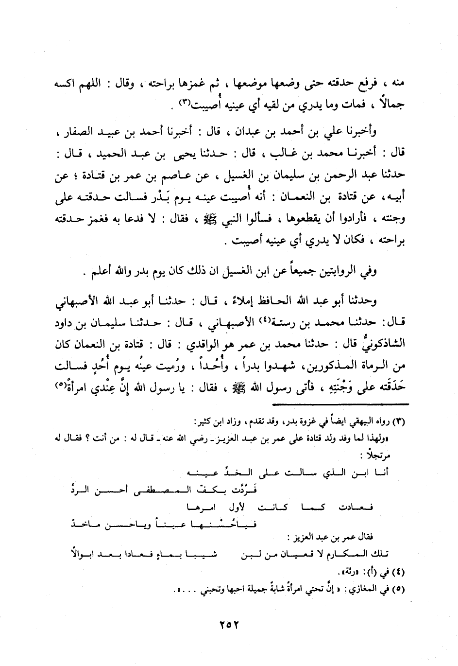 وحَدَّثَنَا أَبُو عَبْدِ اللَّه الْحَافِظُ إِمْلَاءً، قَالَ: حَدَّثَنَا أَبُو عَبْدِ اللَّه الْأَصْبَهَانِيُّ قَالَ: حَدَّثَنَا مُحَمَّدُ بْنُ رُسْتَةَ [ (4) ] الْأَصْبَهَانِيُّ، قَالَ: حَدَّثَنَا سُلَيْمَانُ بْنُ دَاوُدَ الشَّاذَكُونِيُّ قَالَ: حَدَّثَنَا مُحَمَّدُ بْنُ عُمَرَ هُوَ الْوَاقِدِيُّ: قَالَ: قَتَادَةُ بْنُ النُّعْمَانِ كَانَ مِنَ الرُّمَاةِ الْمَذْكُورِينَ، شَهِدُوا بَدْرًا، وَأُحُدًا، وَرُمِيَتْ عَيْنُهُ يَوْمَ أُحُدٍ فَسَالَتْ حَدَقَتُهُ عَلَى وَجْنَتِهِ، فَأَتَى رَسُولَ اللَّه صلى اللَّه عَلَيْهِ وَسَلَّمَ، فَقَالَ: يَا رَسُولَ اللَّه إِنَّ عِنْدِيَ امْرَأَةً [ (5) ]