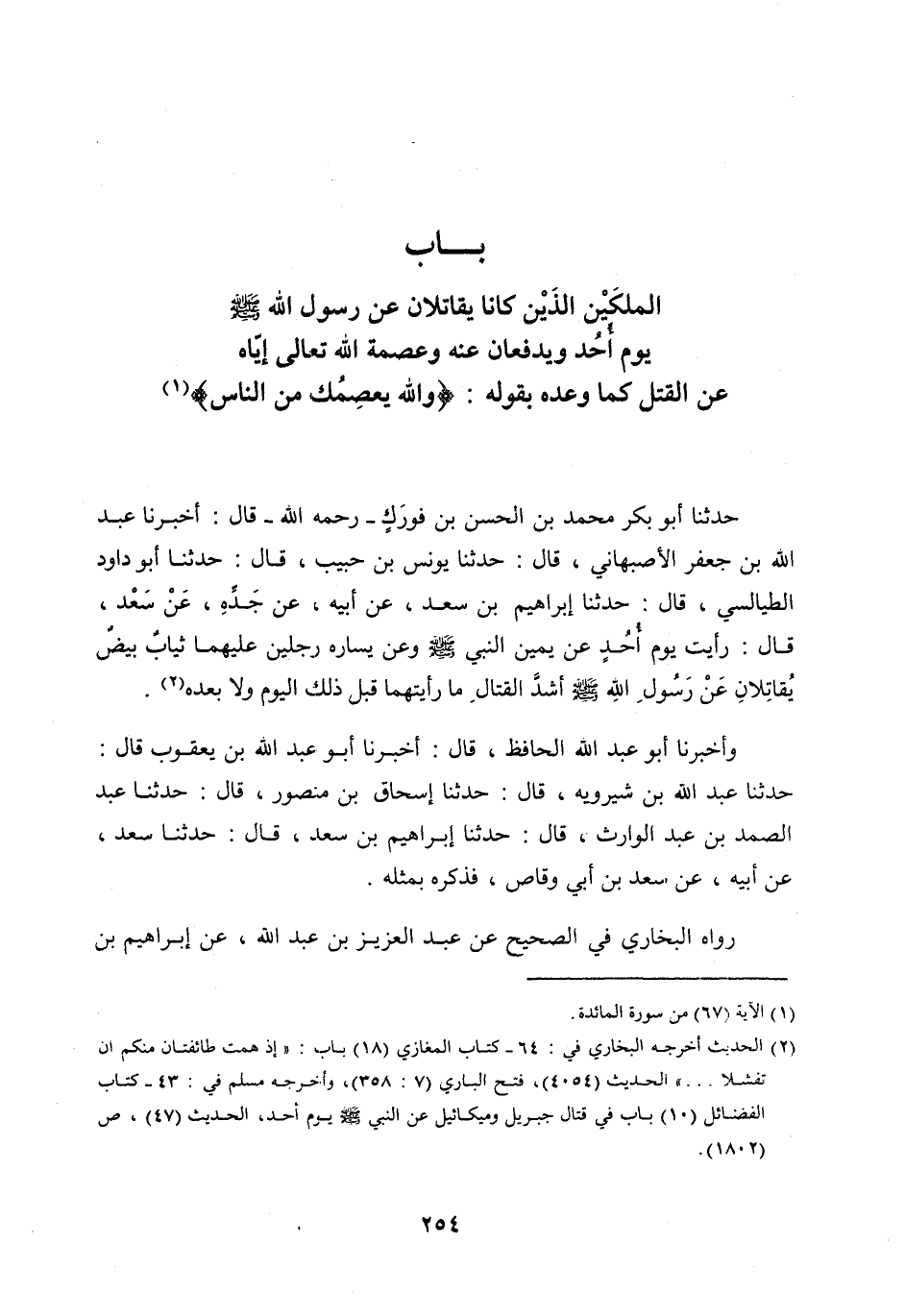 حَدَّثَنَا أَبُو بَكْرٍ مُحَمَّدُ بْنُ الْحَسَنِ بْنِ فُورَكٍ- رَحِمَهُ اللَّه- قَالَ: أَخْبَرَنَا عَبْدُ اللَّه بْنُ جَعْفَرٍ الْأَصْبَهَانِيُّ، قَالَ: حَدَّثَنَا يُونُسُ بْنُ حَبِيبٍ، قَالَ: حَدَّثَنَا أَبُو دَاوُدَ الطَّيَالِسِيُّ، قَالَ: حَدَّثَنَا إِبْرَاهِيمُ بْنُ سَعْدٍ، عَنْ أَبِيهِ، عَنْ جَدِّهِ، عَنْ سَعْدٍ، قَالَ: رَأَيْتُ يَوْمَ أُحُدٍ عَنْ يَمِينِ النبي صلى اللَّه عليه وَسَلَّمَ وَعَنْ يَسَارِهِ رَجُلَيْنِ عَلَيْهِمَا ثِيَابٌ بِيضٌ يُقَاتِلَانِ عَنْ رَسُولِ اللَّه صَلَّى اللَّه عليه وسلم أَشَدَّ الْقِتَالِ مَا رَأَيْتُهُمَا قَبْلَ ذَلِكَ الْيَوْمِ وَلَا بَعْدَهُ [ (2) ] .
