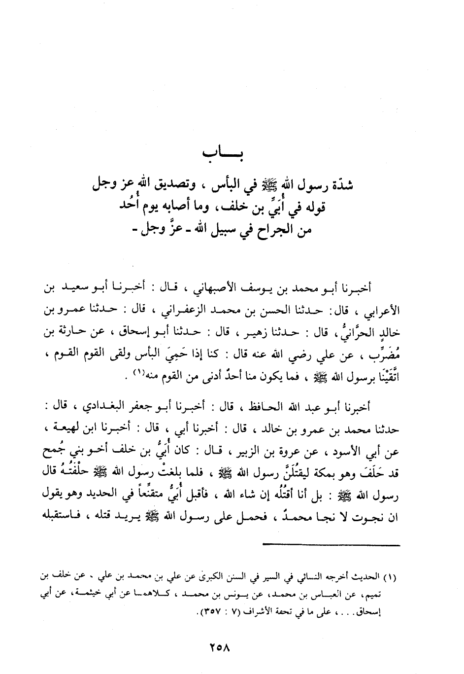 بَابُ شِدَّةِ رَسُولِ اللَّه صَلَّى اللَّه عَلَيْهِ وسلم فِي الْبَأْسِ، وَتَصْدِيقِ اللَّه عَزَّ وَجَلَّ قَوْلَهُ فِي أُبَيِّ بْنِ خَلَفٍ، وَمَا أَصَابَهُ يَوْمَ أُحُدٍ مِنَ الْجِرَاحِ فِي سَبِيلِ اللَّه- عَزَّ وَجَلَّ-