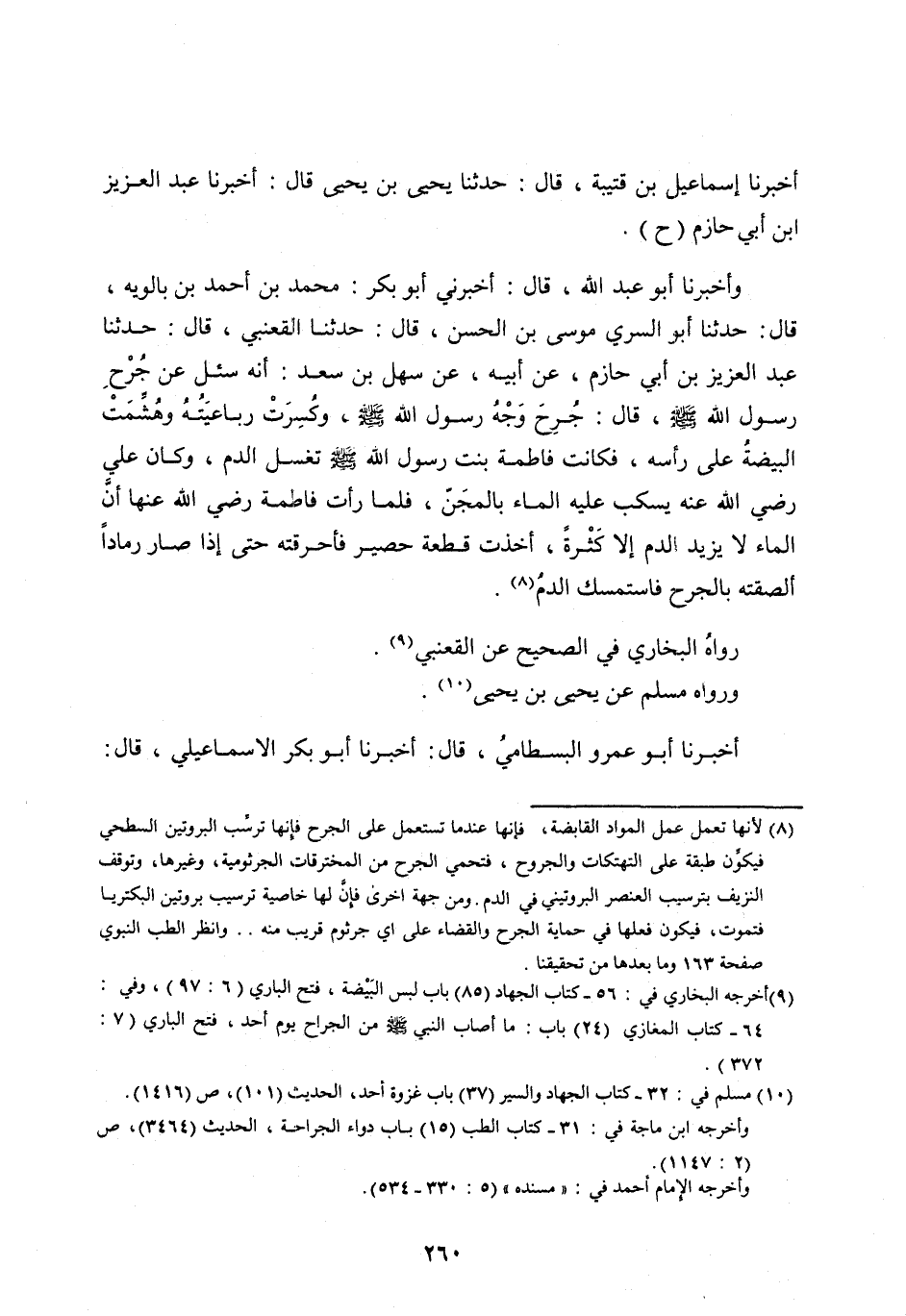 وَأَخْبَرَنَا أَبُو عَبْدِ اللَّه، قَالَ: أَخْبَرَنِي أَبُو بَكْرٍ: مُحَمَّدُ بْنُ أَحْمَدَ بْنِ بَالَوَيْهِ، قَالَ: حَدَّثَنَا أَبُو السَّرِيِّ مُوسَى بْنُ الْحَسَنِ، قَالَ: حَدَّثَنَا الْقَعْنَبِيُّ، قَالَ: حَدَّثَنَا عَبْدُ الْعَزِيزِ بْنُ أَبِي حَازِمٍ، عَنْ أَبِيهِ، عَنْ سَهْلِ بْنِ سَعْدٍ: أَنَّهُ سُئِلَ عَنْ جُرْحِ رَسُولِ اللَّه صَلَّى اللَّه عليه وَسَلَّمَ، قَالَ: جُرِحَ وَجْهُ رَسُولِ اللَّه صَلَّى اللَّه عَلَيْهِ وَسَلَّمَ، وَكُسِرَتْ رَبَاعِيَتُهُ وَهُشِّمَتِ الْبَيْضَةُ عَلَى رَأْسِهِ، فَكَانَتْ فَاطِمَةُ بِنْتُ رَسُولِ اللَّه صلى اللَّه عليه وَسَلَّمَ تَغْسِلُ الدَّمَ، وَكَانَ عَلِيٌّ رَضِيَ اللَّه عَنْهُ يَسْكُبُ عَلَيْهِ الْمَاءَ بِالْمِجَنِّ، فَلَمَّا رَأَتْ فَاطِمَةُ رَضِيَ اللَّه عَنْهَا أَنَّ الْمَاءَ لَا يَزِيدُ الدَّمَ إِلَّا كَثْرَةً، أَخَذَتْ قِطْعَةَ حَصِيرٍ فَأَحْرَقَتْهُ حَتَّى إِذَا صَارَ رَمَادًا أَلْصَقَتْهُ بِالْجُرْحِ فَاسْتَمْسَكَ الدَّمُ [ (8) ] .