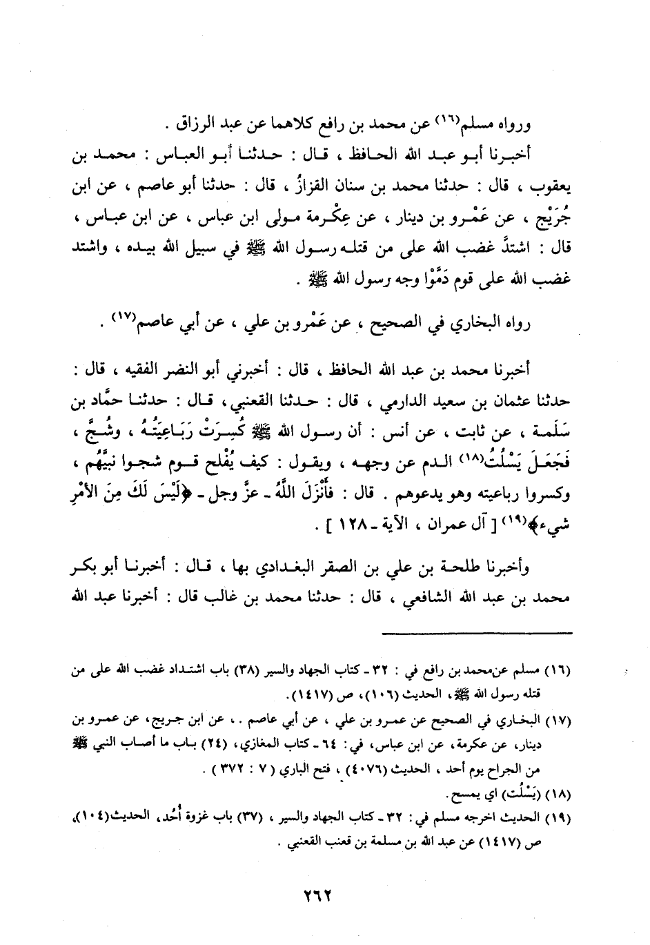 [ (17) ] الْبُخَارِيُّ فِي الصَّحِيحِ عَنْ عَمْرِو بْنِ عَلِيٍّ، عن أبي عَاصِمٍ، عَنِ ابْنِ جُرَيْجٍ، عَنْ عَمْرِو بْنِ دِينَارٍ، عَنْ عِكْرِمَةَ، عَنِ ابْنِ عباس، في: 64- كتاب المغازي، (24) بَابُ مَا أَصَابَ النَّبِيَّ صَلَّى اللَّه عَلَيْهِ وسلم من الجراح يوم أحد، الحديث (4076) ، فتح الباري (7: 372) .
