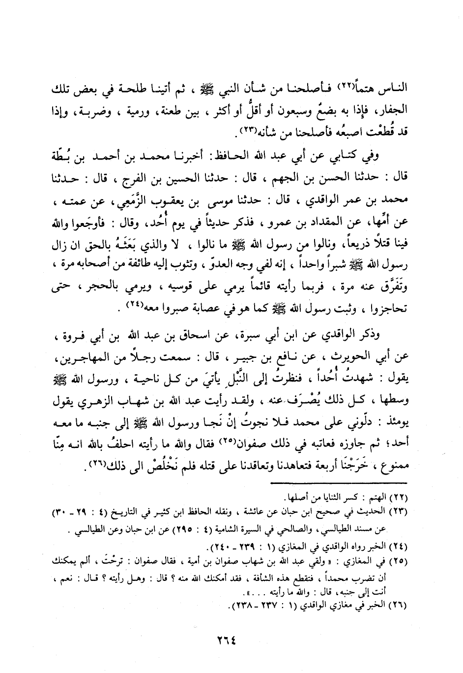 وَفِي كِتَابِي عَنْ أَبِي عَبْدِ اللَّه الْحَافِظِ: أَخْبَرَنَا مُحَمَّدُ بْنُ أَحْمَدَ بْنِ بُطَّةَ قَالَ: حَدَّثَنَا الْحَسَنُ بْنُ الْجَهْمِ، قَالَ: حَدَّثَنَا الْحُسَيْنُ بْنُ الْفَرَجِ، قَالَ: حَدَّثَنَا مُحَمَّدُ بْنُ عُمَرَ الْوَاقِدِيُّ، قَالَ: حَدَّثَنَا مُوسَى بْنُ يَعْقُوبَ الزَّمْعِيُّ، عَنْ عَمَّتِهِ، عَنْ أُمِّهَا، عَنِ الْمِقْدَادِ بْنِ عَمْرٍو، فَذَكَرَ حَدِيثًا فِي يَوْمِ أُحُدٍ، وَقَالَ: فَأَوْجَعُوا واللَّه فِينَا قَتْلًا ذَرِيعًا، وَنَالُوا مِنْ رَسُولِ اللَّه صَلَّى اللَّه عَلَيْهِ وَسَلَّمَ مَا نَالُوا، لَا وَالَّذِي بَعَثَهُ بِالْحَقِّ إِنْ زَالَ رَسُولُ اللَّه صَلَّى اللَّه عليه وسلم شِبْرًا وَاحِدًا، إِنَّهُ لَفِي وَجْهِ الْعَدُوِّ، وَتَثُوبُ إِلَيْهِ طَائِفَةٌ مِنْ أَصْحَابِهِ مَرَّةً، وَتَفَرَّقُ عَنْهُ مَرَّةً، فَرُبَّمَا رَأَيْتُهُ قَائِمًا يَرْمِي عَلَى قَوْسَيْهِ، وَيَرْمِي بِالْحَجَرِ، حَتَّى تَحَاجَزُوا، وَثَبَتَ رَسُولُ اللَّه صلى اللَّه عليه وسلم كَمَا هُوَ فِي عِصَابَةٍ صَبَرُوا مَعَهُ [ (24) ] .