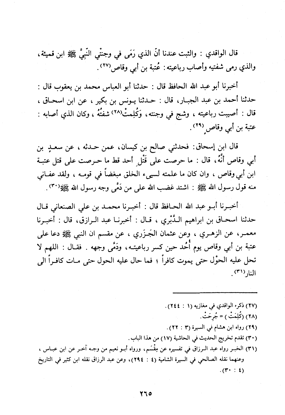 قَالَ الْوَاقِدِيُّ: وَالثَّبْتُ عِنْدَنَا أَنَّ الَّذِي رَمَى فِي وَجْنَتَيِ النَّبِيِّ صَلَّى اللَّه عَلَيْهِ وَسَلَّمَ ابْنُ قَمِيئَةَ، وَالَّذِي رَمَى شَفَتَيْهِ وَأَصَابَ رَبَاعِيَتَهُ: عُتْبَةُ بْنُ أَبِي وَقَّاصٍ [ (27) ] .