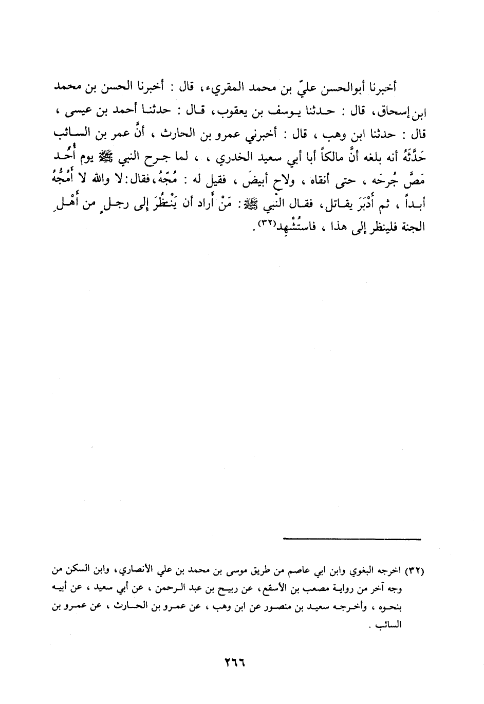 أَخْبَرَنَا أَبُو الْحَسَنِ عَلِيُّ بْنُ مُحَمَّدٍ الْمُقْرِئُ، قَالَ: أَخْبَرَنَا الْحَسَنُ بْنُ مُحَمَّدِ ابْنِ إِسْحَاقَ، قَالَ: حَدَّثَنَا يُوسُفُ بْنُ يَعْقُوبَ، قَالَ: حَدَّثَنَا أَحْمَدُ بْنُ عِيسَى، قَالَ: حَدَّثَنَا ابْنُ وَهْبٍ، قَالَ: أَخْبَرَنِي عَمْرُو بْنُ الْحَارِثِ، أَنَّ عُمَرَ بْنَ السَّائِبِ حَدَّثَهُ أَنَّهُ بَلَغَهُ أَنَّ مَالِكًا أَبَا أَبِي سَعِيدٍ الْخُدْرِيِّ،، لَمَّا جُرِحَ النبي صلى اللَّه عليه وَسَلَّمَ يَوْمَ أُحُدٍ مَصَّ جُرْحَهُ، حَتَّى أَنْقَاهُ، وَلَاحَ أَبْيَضَ، فَقِيلَ لَهُ: مُجَّهُ، فَقَالَ: لَا واللَّه لَا أَمُجُّهُ أَبَدًا، ثُمَّ أَدْبَرَ يُقَاتِلُ، فَقَالَ النَّبِيُّ صَلَّى اللَّه عليه وسلم: مَنْ أَرَادَ أَنْ يَنْظُرَ إِلَى رَجُلٍ مِنْ أَهْلِ الْجَنَّةِ فَلْيَنْظُرْ إِلَى هَذَا، فَاسْتُشْهِدَ [ (32) ] .