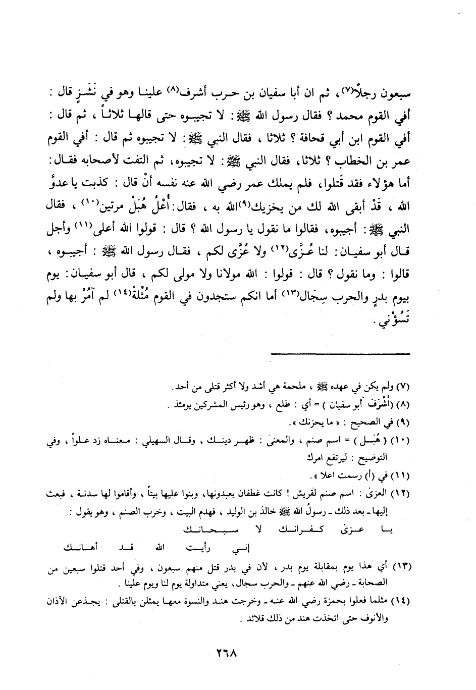 أَمَّا هَؤُلَاءِ فَقَدْ قُتِلُوا، فَلَمْ يَمْلِكُ عُمَرُ رَضِيَ اللَّه عَنْهُ نَفْسَهُ أَنْ قَالَ: كَذَبْتَ يَا عَدُوَّ اللَّه، قَدْ أَبْقَى اللَّه لَكَ مَنْ يُخْزِيكَ [ (9) ] اللَّه بِهِ، فَقَالَ: اعْلُ هُبَلُ مَرَّتَيْنِ [ (10) ] ، فَقَالَ النَّبِيُّ صَلَّى اللَّه عليه وسلم: أَجِيبُوهُ، فَقَالُوا مَا نَقُولُ يَا رَسُولَ اللَّه؟ قَالَ: قُولُوا اللَّه أَعْلَى [ (11) ] وَأَجَلُّ قَالَ أَبُو سُفْيَانَ: لَنَا عُزَّى [ (12) ] وَلَا عُزَّى لَكُمْ، فَقَالَ رَسُولُ اللَّه صَلَّى اللَّه عَلَيْهِ وَسَلَّمَ: أَجِيبُوهُ، قَالُوا: وَمَا نَقُولُ؟ قَالَ: قُولُوا: اللَّه مَوْلَانَا وَلَا مَوْلَى لَكُمْ، قَالَ أَبُو سُفْيَانَ: يَوْمٌ بِيَوْمِ بَدْرٍ وَالْحَرْبُ سِجَالٌ [ (13) ] أَمَا إِنَّكُمْ سَتَجِدُونَ فِي الْقَوْمِ مُثْلَةً [ (14) ] لَمْ آمُرْ بِهَا وَلَمْ تسؤني.