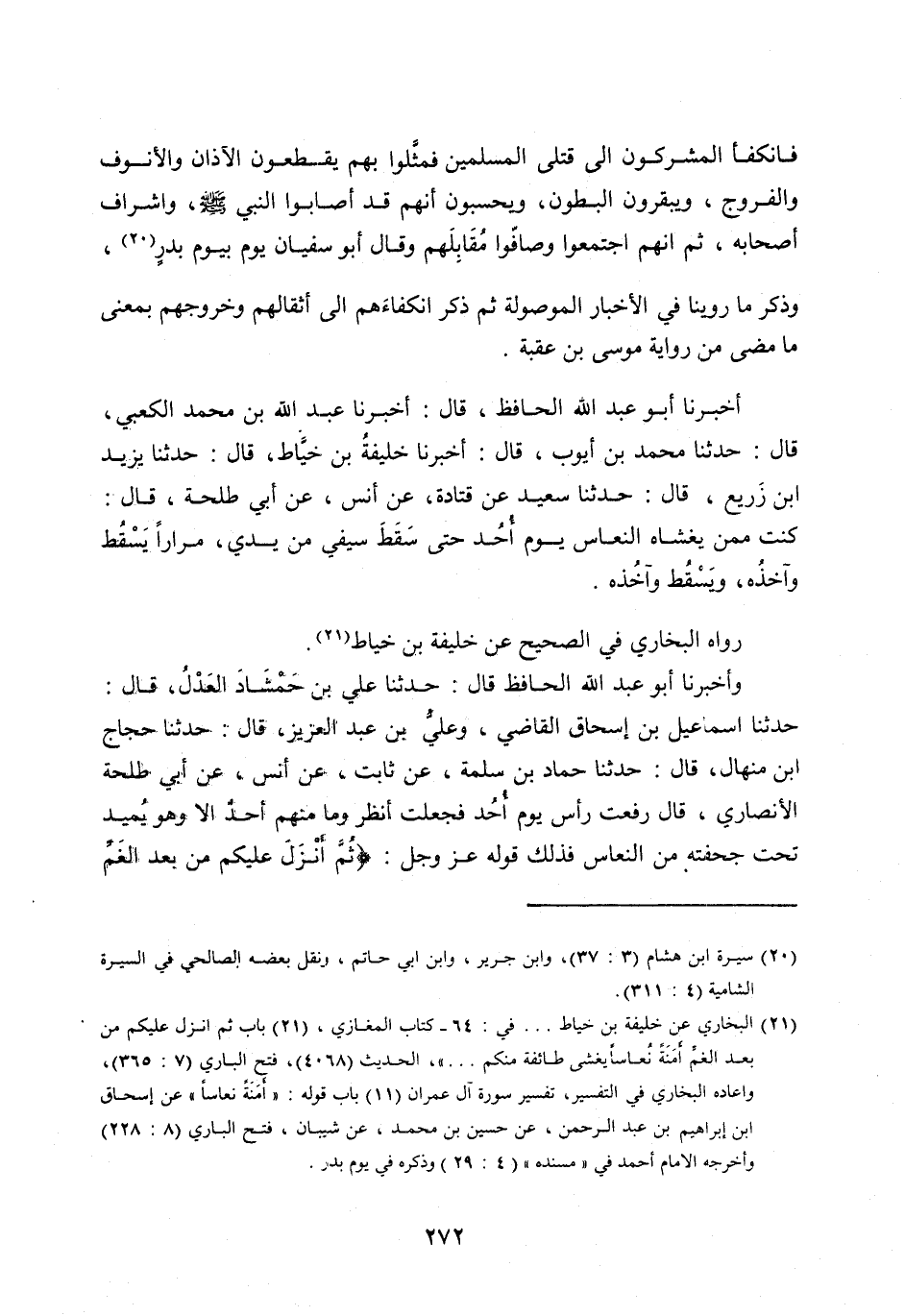 [ (21) ] البخاري عَنْ خَلِيفَةَ بْنِ خَيَّاطٍ ... في: 64- كتاب المغازي، (21) باب ثُمَّ أَنْزَلَ عَلَيْكُمْ مِنْ بَعْدِ الْغَمِّ أَمَنَةً نُعَاسًا يغشى طائفة منكم ... » ، الحديث (4068) ، فتح الباري (7: 365) ، واعاده البخاري في التفسير، تفسير سورة آل عمران (11) باب قوله: «أمنة نعاسا» عن إسحاق ابن إبراهيم بن عبد الرحمن، عن حُسَيْنُ بْنِ مُحَمَّدٍ، عَنْ شَيْبَانَ، فتح الباري (8: 228) وأخرجه الامام أحمد في «مسنده» (4: 29) وذكره في يوم بدر.