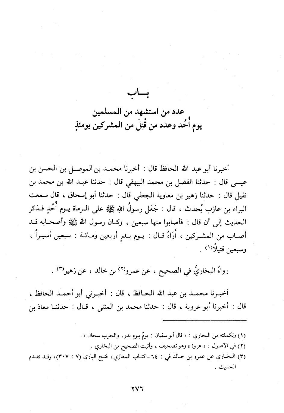 أَخْبَرَنَا أَبُو عَبْدِ اللَّه الْحَافِظُ قَالَ: أَخْبَرَنَا مُحَمَّدُ بْنُ الْمَوْصِلِ بْنِ الْحَسَنِ بْنِ عِيسَى قَالَ: حَدَّثَنَا الْفَضْلُ بْنُ مُحَمَّدٍ الْبَيْهَقِيُّ قَالَ: حَدَّثَنَا عَبْدُ اللَّه بْنُ مُحَمَّدِ بْنِ نُفَيْلٍ قَالَ: حَدَّثَنَا زُهَيْرُ بْنُ مُعَاوِيَةَ الْجُعْفِيُّ قَالَ: حَدَّثَنَا أَبُو إِسْحَاقَ، قَالَ سَمِعْتُ الْبَرَاءَ بْنَ عَازِبٍ يُحَدِّثُ، قَالَ: جَعَلَ رَسُولُ اللَّه صَلَّى اللَّه عَلَيْهِ وسلم عَلَى الرُّمَاةِ يَوْمَ أُحُدٍ فَذَكَرَ الْحَدِيثَ إِلَى أَنْ قَالَ: فَأَصَابُوا مِنْهَا سَبْعِينَ، وَكَانَ رَسُولُ اللَّه صَلَّى اللَّه عَلَيْهِ وَسَلَّمَ وَأَصْحَابُهُ قَدْ أَصَابَ مِنَ الْمُشْرِكِينَ، أُرَاهُ قَالَ: يَوْمَ بَدْرٍ أَرْبَعِينَ وَمِائَةً: سَبْعِينَ أَسِيرًا، وَسَبْعِينَ قَتِيلًا [ (1) ] .