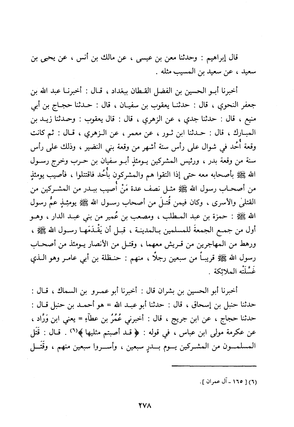 أَخْبَرَنَا أَبُو الْحُسَيْنِ بْنُ الْفَضْلِ الْقَطَّانُ بِبَغْدَادَ، قَالَ: أَخْبَرَنَا عَبْدُ اللَّه بْنُ جَعْفَرٍ النَّحْوِيُّ، قَالَ: حَدَّثَنَا يَعْقُوبُ بْنُ سُفْيَانَ، قَالَ: حَدَّثَنَا حَجَّاجُ بْنُ أَبِي مَنِيعٍ، قَالَ: حَدَّثَنَا جَدِّي، عَنِ الزُّهْرِيِّ، قَالَ: قَالَ يَعْقُوبُ: وَحَدَّثَنَا زَيْدُ بْنُ الْمُبَارَكِ، قَالَ: حَدَّثَنَا ابْنُ ثَوْرٍ، عَنْ مَعْمَرٍ، عَنِ الزُّهْرِيِّ، قَالَ: ثُمَّ كَانَتْ وَقْعَةُ أُحُدٍ فِي شَوَّالٍ عَلَى رَأْسِ سِتَّةِ أَشْهُرٍ مِنْ وَقْعَةِ بَنِي النَّضِيرِ، وَذَلِكَ عَلَى رَأْسِ سَنَةٍ مِنْ وَقْعَةِ بَدْرٍ، وَرَئِيسُ الْمُشْرِكِينَ يَوْمَئِذٍ أَبُو سُفْيَانَ بْنُ حَرْبٍ وَخَرَجَ رَسُولُ اللَّه صَلَّى اللَّه عَلَيْهِ وَسَلَّمَ بِأَصْحَابِهِ مَعَهُ حَتَّى إِذَا الْتَقَوْا هُمْ وَالْمُشْرِكُونَ بِأُحُدٍ فَاقْتَتَلُوا، فَأُصِيبَ يَوْمَئِذٍ مِنْ أَصْحَابِ رَسُولِ اللَّه صَلَّى اللَّه عَلَيْهِ وسلم مِثْلُ نِصْفِ عِدَّةِ مَنْ أُصِيبَ بِبَدْرٍ مِنَ الْمُشْرِكِينَ مِنَ الْقَتْلَى وَالْأَسْرَى، وَكَانَ فِيمَنْ قُتِلَ مِنْ أَصْحَابِ رَسُولِ اللَّه صَلَّى اللَّه عَلَيْهِ وَسَلَّمَ يَوْمَئِذٍ عَمُّ رَسُولِ اللَّه صَلَّى اللَّه عَلَيْهِ وَسَلَّمَ: حَمْزَةُ بْنُ عَبْدِ الْمُطَّلِبِ، وَمُصْعَبُ بْنُ عُمَيْرٍ مِنْ بَنِي عَبْدِ الدَّارِ، وَهُوَ أَوَّلُ مَنْ جَمَّعَ الْجُمُعَةَ لِلْمُسْلِمِينَ بِالْمَدِينَةِ، قَبْلَ أن يقدمها رسول اللَّه صلى اللَّه عليه وسلم، وَرَهْطٌ مِنَ الْمُهَاجِرِينَ مِنْ قُرَيْشٍ مَعَهُمَا، وَقُتِلَ مِنَ الْأَنْصَارِ يَوْمَئِذٍ مِنْ أَصْحَابِ رَسُولِ اللَّه صَلَّى اللَّه عَلَيْهِ وسلم قريبا مِنْ سَبْعِينَ رَجُلًا، مِنْهُمْ: حَنْظَلَةُ بْنُ أَبِي عَامِرٍ وَهُوَ الَّذِي غَسَّلَتْهُ الْمَلَائِكَةُ.