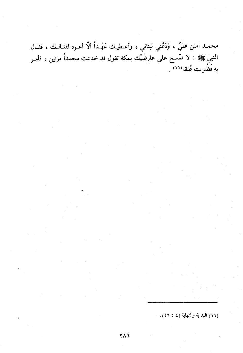 مُحَمَّدُ امْنُنْ عَلَيَّ، وَدَعْنِي لِبَنَاتِي، وَأُعْطِيكَ عَهْدًا أَلَّا أَعُودَ لِقِتَالِكَ، فَقَالَ النَّبِيُّ صَلَّى اللَّه عليه وسلم: لَا تَمْسَحْ عَلَيَّ عَارِضَيْكَ بِمَكَّةَ تَقُولُ قَدْ خَدَعْتُ مُحَمَّدًا مَرَّتَيْنِ، فَأَمَرَ بِهِ فَضُرِبَتْ عُنُقُهُ [ (11) ] .