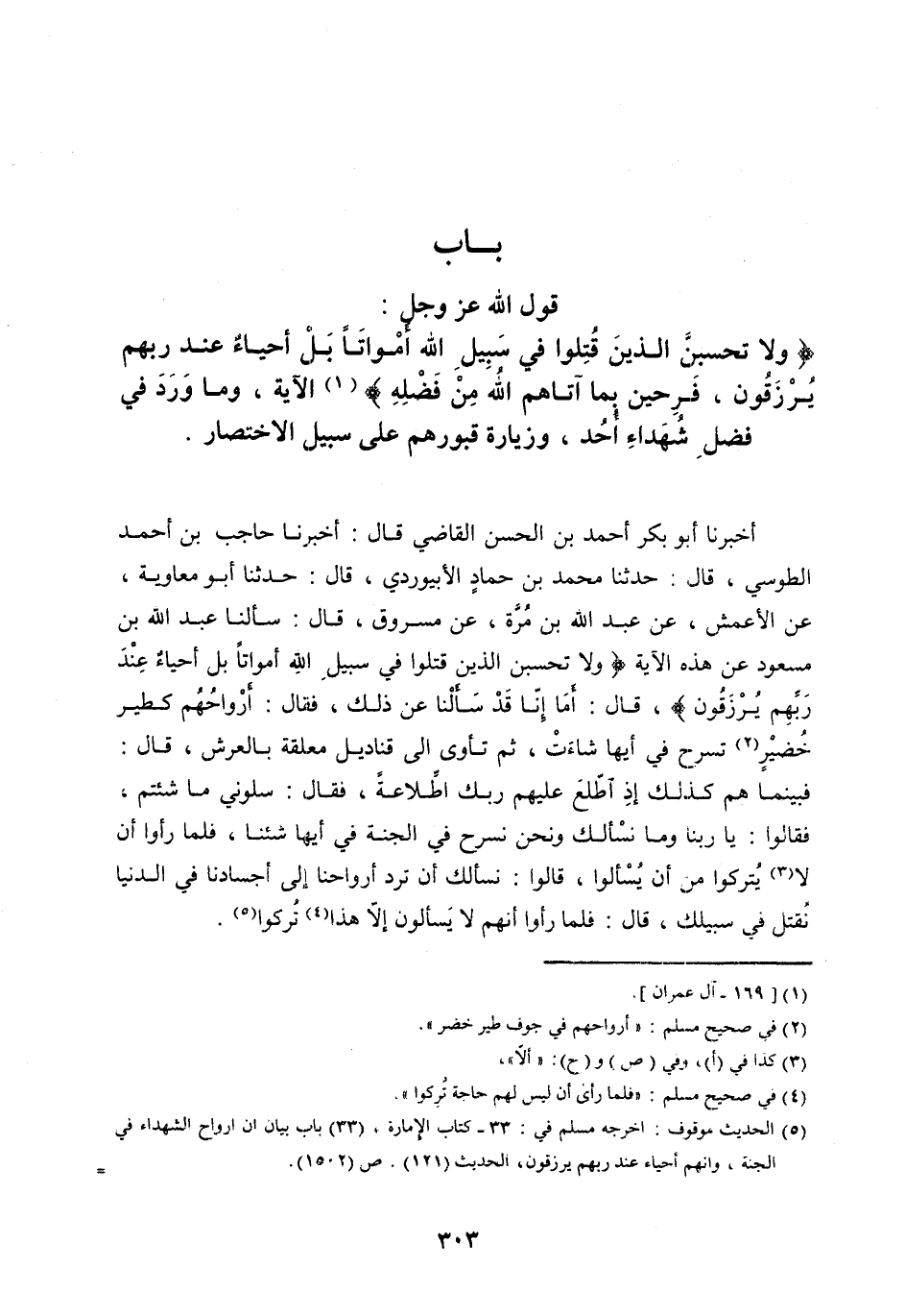 أَخْبَرَنَا أَبُو بَكْرٍ أَحْمَدُ بْنُ الْحَسَنِ الْقَاضِي قَالَ: أَخْبَرَنَا حَاجِبُ بْنُ أَحْمَدَ الطُّوسِيُّ، قَالَ: حَدَّثَنَا مُحَمَّدُ بْنُ حَمَّادٍ الْأَبِيوَرْدِيُّ، قَالَ: حَدَّثَنَا أَبُو مُعَاوِيَةَ، عَنِ الْأَعْمَشِ، عَنْ عَبْدِ اللَّه بْنِ مُرَّةَ، عَنْ مَسْرُوقٍ، قَالَ: سَأَلْنَا عَبْدَ اللَّه بْنَ مَسْعُودٍ عَنْ هَذِهِ الْآيَةِ وَلا تَحْسَبَنَّ الَّذِينَ قُتِلُوا فِي سَبِيلِ اللَّهِ أَمْواتاً بَلْ أَحْياءٌ عِنْدَ رَبِّهِمْ يُرْزَقُونَ، قَالَ: أَمَا إِنَّا قَدْ سَأَلْنَا عَنْ ذَلِكَ، فَقَالَ: أَرْوَاحُهُمْ كَطَيْرٍ خُضَيْرٍ [ (2) ] تَسْرَحُ فِي أَيِّهَا شَاءَتْ، ثُمَّ تَأْوِي إِلَى قَنَادِيلَ مُعَلَّقَةٍ بِالْعَرْشِ، قَالَ: