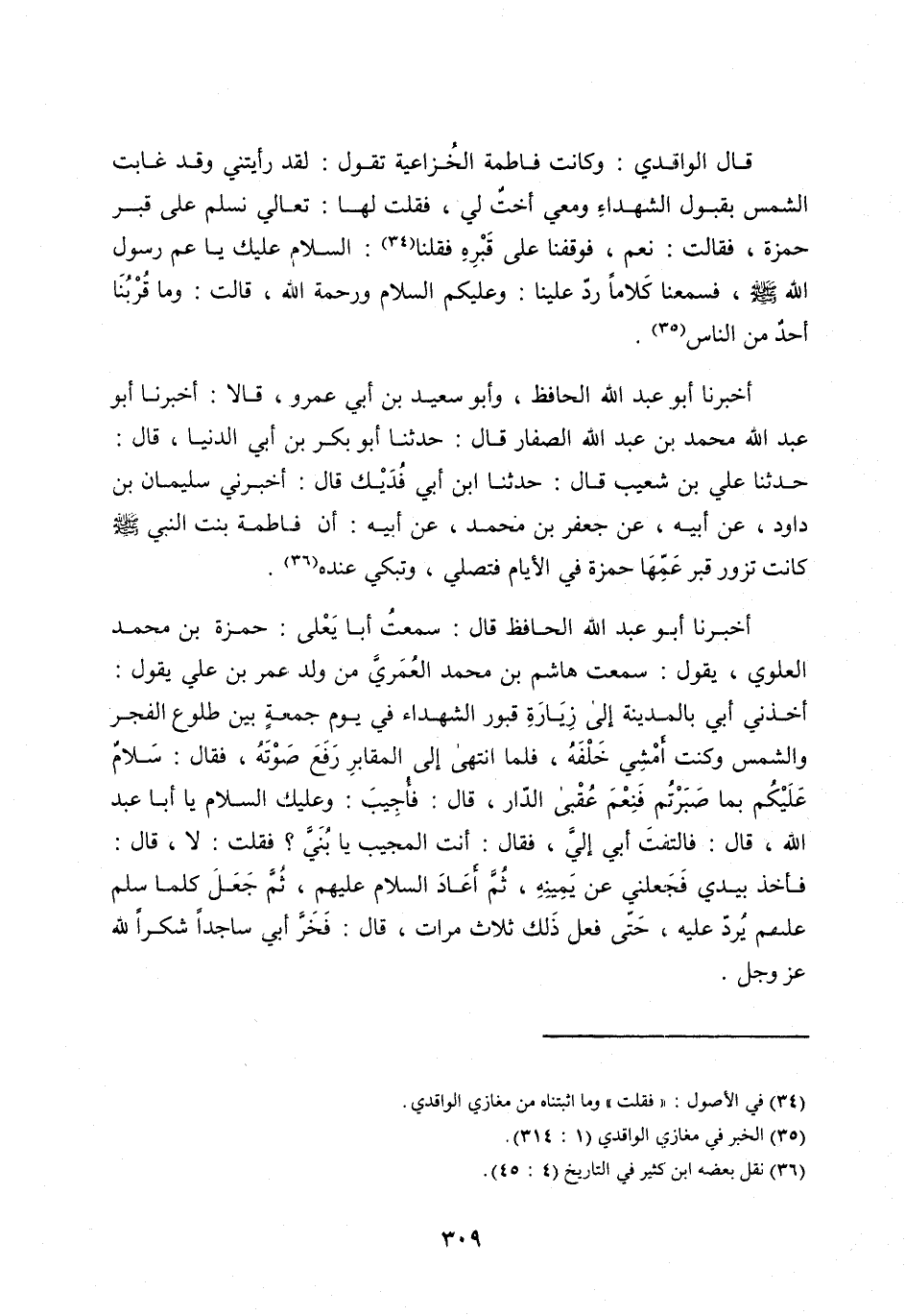 قَالَ الْوَاقِدِيُّ: وَكَانَتْ فَاطِمَةُ الْخُزَاعِيَّةُ تَقُولُ: لَقَدْ رَأَيْتُنِي وقد غابت الشمس بقبول الشُّهَدَاءِ وَمَعِي أُخْتٌ لِي، فَقُلْتُ لَهَا: تَعَالَيْ نُسَلِّمْ عَلَى قَبْرِ حَمْزَةَ، فَقَالَتْ: نَعَمْ، فَوَقَفْنَا عَلَى قَبْرِهِ فَقُلْنَا [ (34) ] : السَّلَامُ عَلَيْكَ يَا عَمَّ رَسُولِ اللَّه صَلَّى اللَّه عَلَيْهِ وَسَلَّمَ، فَسَمِعْنَا كَلَامًا رَدَّ عَلَيْنَا: وَعَلَيْكُمُ السَّلَامُ وَرَحْمَةُ اللَّه، قَالَتْ: وَمَا قُرْبَنَا أَحَدٌ مِنَ النَّاسِ [ (35) ] .