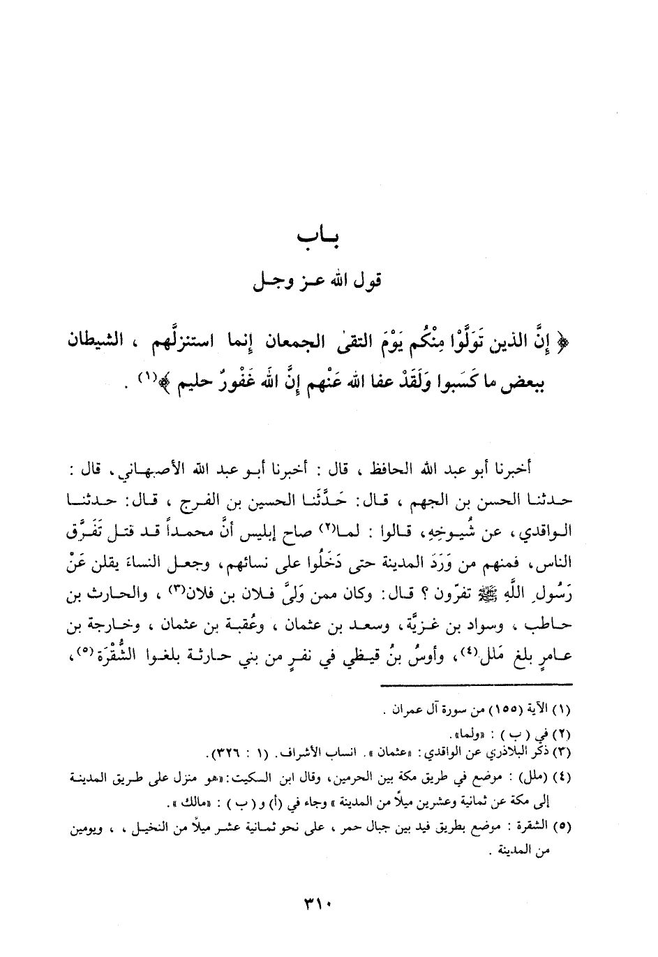 حَدَّثَنَا الْحَسَنُ بْنُ الْجَهْمِ، قَالَ: حَدَّثَنَا الْحُسَيْنُ بْنُ الْفَرَجِ، قَالَ: حَدَّثَنَا الْوَاقِدِيُّ، عَنْ شُيُوخِهِ، قَالُوا: لَمَّا [ (2) ] صَاحَ إِبْلِيسُ أَنَّ مُحَمَّدًا قَدْ قُتِلَ تَفَرَّقَ النَّاسُ، فَمِنْهُمْ مَنْ وَرَدَ الْمَدِينَةَ حَتَّى دَخَلُوا عَلَى نِسَائِهِمْ، وَجَعَلَ النِّسَاءُ يَقُلْنَ عَنْ رَسُولِ اللَّه صَلَّى اللَّه عَلَيْهِ وَسَلَّمَ تَفِرُّونَ؟ قَالَ: وَكَانَ مِمَّنْ وَلَّى فُلَانُ بْنُ فُلَانٍ [ (3) ] ، وَالْحَارِثُ بْنُ حَاطِبٍ، وَسَوَّادُ بْنُ غَزِيَّةَ، وَسَعْدُ بْنُ عُثْمَانَ، وَعُقْبَةُ بْنُ عُثْمَانَ، وَخَارِجَةُ بْنُ عَامِرٍ بَلَغَ مَلَلَ [ (4) ] ، وَأَوْسُ بْنُ قَيْظِيٍّ فِي نَفَرٍ مِنْ بَنِي حَارِثَةَ بَلَغُوا الشّقرة [ (5) ] ،
