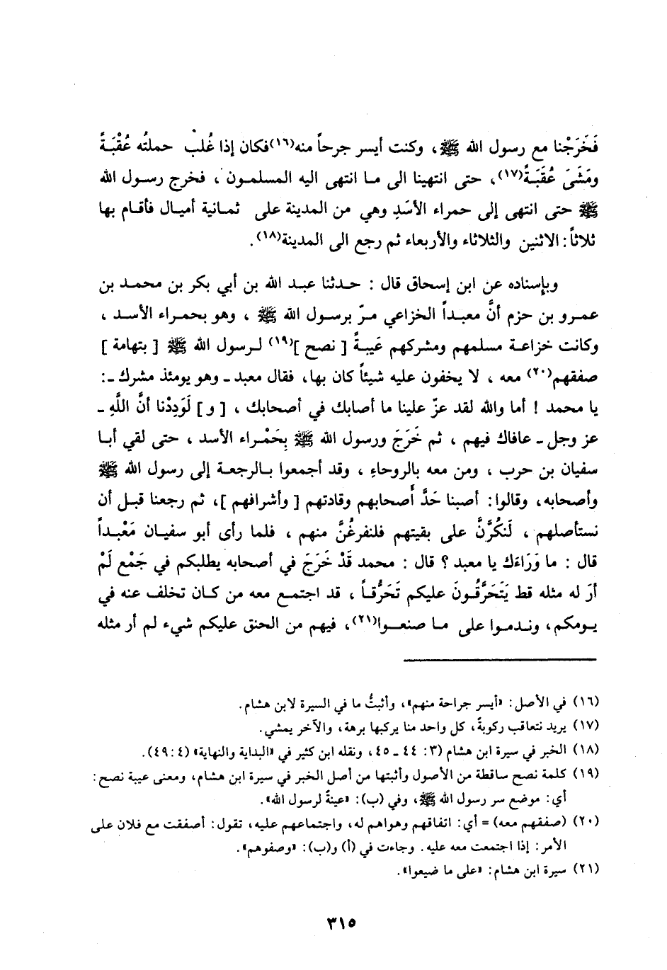 فَخَرَجْنَا مَعَ رَسُولِ اللهِ صَلَّى اللهُ عَلَيْهِ وَسَلَّمَ، وَكُنْتُ أَيْسَرَ جُرْحًا مِنْهُ [ (16) ] فَكَانَ إِذَا غُلِبَ حَمَلْتُهُ عُقْبَةً وَمَشَى عُقْبَةً [ (17) ] ، حَتَّى انْتَهَيْنَا إِلَى مَا انْتَهَى إِلَيْهِ الْمُسْلِمُونَ، فَخَرَجَ رَسُولُ اللهِ صَلَّى اللَّه عَلَيْهِ وَسَلَّمَ حَتَّى انْتَهَى إِلَى حَمْرَاءِ الْأَسَدِ وَهِيَ مِنَ الْمَدِينَةِ عَلَى ثَمَانِيَةِ أَمْيَالٍ فَأَقَامَ بِهَا ثَلَاثًا: الْإِثْنَيْنَ وَالثُّلَاثَاءَ وَالْأَرْبِعَاءَ ثُمَّ رَجَعَ إِلَى الْمَدِينَةِ [ (18) ] .