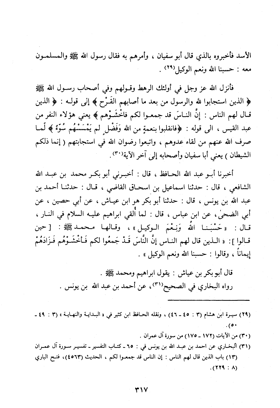 الْأَسَدِ فَأَخْبَرُوهُ بِالَّذِي قَالَ أَبُو سُفْيَانَ، وَأَمَرَهُمْ بِهِ فَقَالَ رَسُولُ اللهِ صَلَّى اللهُ عَلَيْهِ وَسَلَّمَ وَالْمُسْلِمُونَ مَعَهُ: حَسْبُنَا اللهُ وَنِعْمَ الْوَكِيلُ [ (29) ] .