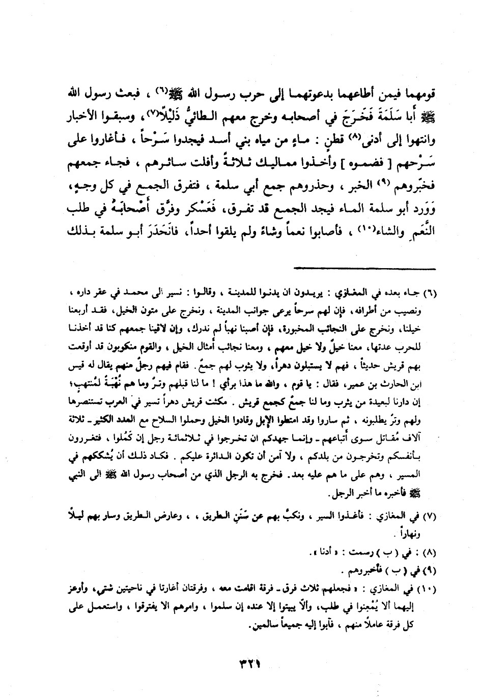 قَوْمِهِمَا فِيمَنْ أَطَاعَهُمَا بِدَعْوَتِهِمَا إِلَى حَرْبِ رَسُولِ اللهِ صلى الله عليه وسلم [ (6) ] ، فَبَعَثَ رَسُولُ اللهِ صَلَّى اللَّه عَلَيْهِ وَسَلَّمَ أَبَا سَلَمَةَ فَخَرَجَ فِي أَصْحَابِهِ وخرج معهم الطائيّ ذليلا [ (7) ] ، وَسَبَقُوا الْأَخْبَارَ وَانْتَهَوْا إِلَى أَدْنَى [ (8) ] قَطَنٍ: مَاءٍ مِنْ مِيَاهِ بَنِي أسد فيجدوا سَرْحًا، فَأَغَارُوا عَلَى سَرْحِهِمْ [فَضَمُّوهُ] وَأَخَذُوا مَمَالِيكَ ثَلَاثَةً وَأَفْلَتَ سَائِرُهُمْ، فَجَاءَ جَمْعُهُمْ فَخَبَّرُوهُمُ [ (9) ] الْخَبَرَ، وَحَذَّرُوهُمْ جَمْعَ أَبِي سَلَمَةَ، فَتَفَرَّقَ الْجَمْعُ فِي كُلِّ وَجْهٍ، وَوَرَدَ أَبُو سَلَمَةَ الْمَاءَ فَيَجِدُ الْجَمْعَ قَدْ تَفَرَّقَ، فَعَسْكَرَ وَفَرَّقَ أَصْحَابَهُ فِي طَلَبِ النَّعَمِ وَالشَّاءِ [ (10) ] ، فَأَصَابُوا نَعَمًا وَشَاءً وَلَمْ يَلْقَوْا أَحَدًا، فَانْحَدَرَ أَبُو سَلَمَةَ بِذَلِكَ