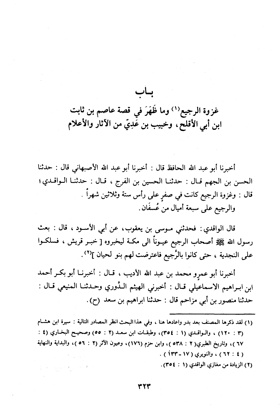 أخبرنا أبو عبد الله الْحَافِظُ قَالَ: أَخْبَرَنَا أَبُو عَبْدِ اللهِ الْأَصْبَهَانِيُّ قَالَ: حَدَّثَنَا الْحَسَنُ بْنُ الْجَهْمِ قَالَ: حَدَّثَنَا الْحُسَيْنُ بْنُ الْفَرَجِ، قَالَ: حَدَّثَنَا الْوَاقِدِيُّ، قَالَ: وَغَزْوَةُ الرَّجِيعِ كَانَتْ فِي صَفَرٍ عَلَى رَأْسِ سِتَّةٍ وَثَلَاثِينَ شَهْرًا.
