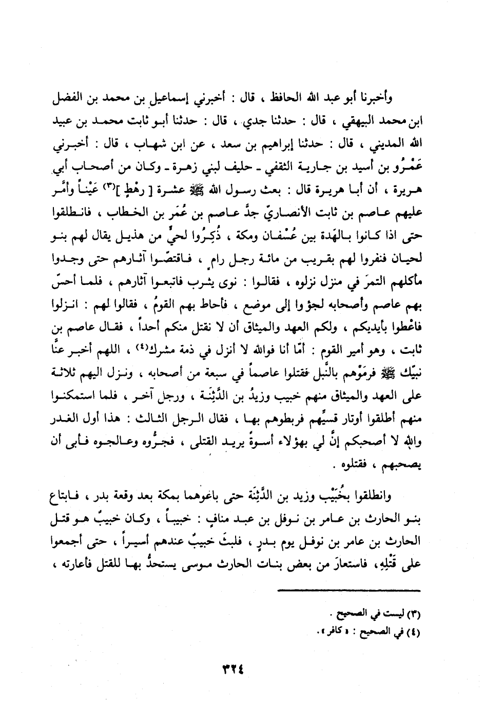 وَأَخْبَرَنَا أَبُو عَبْدِ اللهِ الْحَافِظُ، قَالَ: أَخْبَرَنِي إِسْمَاعِيلُ بن محمد بن الفضل ابن مُحَمَّدٍ الْبَيْهَقِيُّ، قَالَ: حَدَّثَنَا جَدِّي، قَالَ: حَدَّثَنَا أَبُو ثَابِتٍ مُحَمَّدُ بْنُ عُبَيْدِ اللهِ الْمَدِينِيُّ، قَالَ: حَدَّثَنَا إِبْرَاهِيمُ بْنُ سَعْدٍ، عَنِ ابْنِ شِهَابٍ، قَالَ: أَخْبَرَنِي عَمْرُو بْنُ أُسَيْدِ بْنِ جَارِيَةَ الثَّقَفِيُّ- حَلِيفٌ لِبَنِي زُهْرَةَ- وَكَانَ مِنْ أَصْحَابِ أَبِي هُرَيْرَةَ، أَنَّ أَبَا هُرَيْرَةَ قَالَ: بَعَثَ رَسُولُ اللهِ صَلَّى اللهُ عَلَيْهِ وَسَلَّمَ عَشَرَةَ [رَهْطٍ] [ (3) ] عَيْنًا وَأَمَّرَ عَلَيْهِمْ عَاصِمَ بْنَ ثَابِتٍ الْأَنْصَارِيَّ جَدَّ عَاصِمِ بْنِ عُمَرَ بْنِ الْخَطَّابِ، فَانْطَلَقُوا حَتَّى إِذَا كَانُوا بِالْهَدَّةِ بَيْنَ عُسْفَانَ وَمَكَّةَ، ذُكِرُوا لِحَيٍّ مِنْ هُذَيْلٍ يُقَالُ لَهُمْ بَنُو لِحْيَانَ فَنَفَرُوا لَهُمْ بِقَرِيبٍ مِنْ مِائَةِ رَجُلٍ رَامٍ، فَاقْتَصُّوا آثَارَهُمْ حَتَّى وَجَدُوا مَأْكَلَهُمُ التَّمْرَ فِي مَنْزِلٍ نَزَلُوهُ، فَقَالُوا: نَوَى يَثْرِبَ فَاتَّبَعُوا آثَارَهُمْ، فَلَمَّا أَحَسَّ بِهِمْ عاصم وأصحابه لجؤوا إِلَى مَوْضِعٍ، فَأَحَاطَ بِهِمُ الْقَوْمُ، فَقَالُوا لَهُمُ: انْزِلُوا فَأَعْطُوا بِأَيْدِيكُمْ، وَلَكُمُ الْعَهْدُ وَالْمِيثَاقُ أَنْ لَا نَقْتُلَ مِنْكُمْ أَحَدًا، فَقَالَ عَاصِمُ بْنُ ثَابِتٍ، وَهُوَ أَمِيرُ القوم: أمّا أنا فو الله لَا أَنْزِلُ فِي ذِمَّةِ مُشْرِكٍ [ (4) ] ، اللهُمَّ أَخْبِرْ عَنَّا نَبِيَّكَ صَلَّى اللَّه عَلَيْهِ وَسَلَّمَ فَرَمَوْهُمْ بِالنَّبْلِ فَقَتَلُوا عَاصِمًا فِي سَبْعَةٍ مِنْ أَصْحَابِهِ، وَنَزَلَ إِلَيْهِمْ ثَلَاثَةٌ عَلَى الْعَهْدِ وَالْمِيثَاقِ مِنْهُمْ خُبَيْبٌ وَزَيْدُ بْنُ الدِّثِنَّةِ، وَرَجُلٌ آخَرُ، فَلَمَّا اسْتَمْكَنُوا مِنْهُمْ أَطْلَقُوا أَوْتَارَ قِسِيِّهِمْ فَرَبَطُوهُمْ بِهَا، فَقَالَ الرَّجُلُ الثَّالِثُ: هَذَا أَوَّلُ الْغَدْرِ وَاللهِ لَا أَصْحَبُكُمْ إِنَّ لِي بِهَؤُلَاءِ أُسْوَةً يُرِيدُ الْقَتْلَى، فَجَرُّوهُ وَعَالَجُوهُ فَأَبَى أَنْ يَصْحَبَهُمْ، فَقَتَلُوهُ.