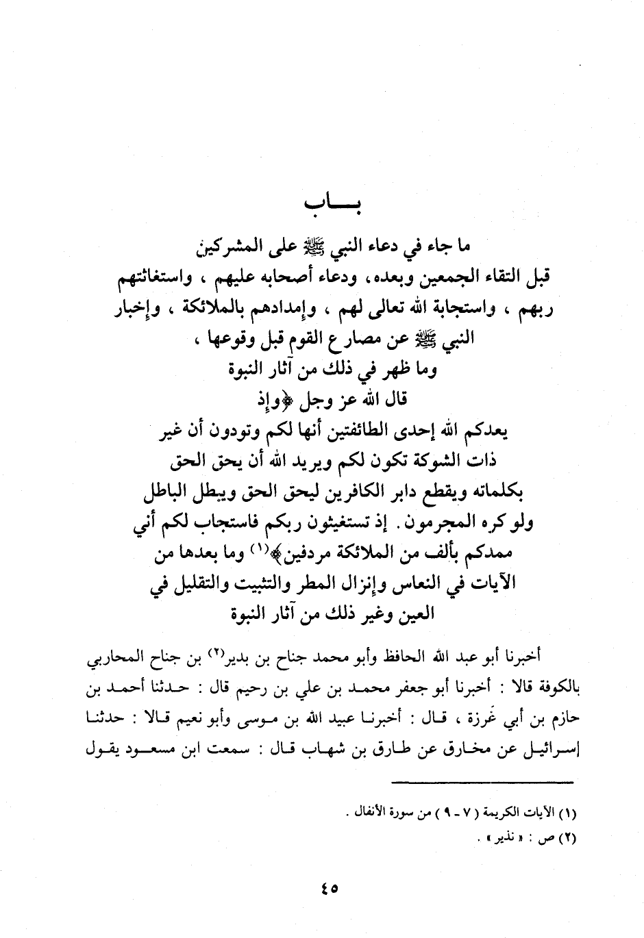 قَالَ اللهُ عَزَّ وَجَلَّ وَإِذْ يَعِدُكُمُ اللَّهُ إِحْدَى الطَّائِفَتَيْنِ أَنَّها لَكُمْ وَتَوَدُّونَ أَنَّ غَيْرَ ذاتِ الشَّوْكَةِ تَكُونُ لَكُمْ وَيُرِيدُ اللَّهُ أَنْ يُحِقَّ الْحَقَّ بِكَلِماتِهِ وَيَقْطَعَ دابِرَ الْكافِرِينَ لِيُحِقَّ الْحَقَّ وَيُبْطِلَ الْباطِلَ وَلَوْ كَرِهَ الْمُجْرِمُونَ. إِذْ تَسْتَغِيثُونَ رَبَّكُمْ فَاسْتَجابَ لَكُمْ أَنِّي مُمِدُّكُمْ بِأَلْفٍ مِنَ الْمَلائِكَةِ مُرْدِفِينَ [ (1) ] وَمَا بَعْدَهَا مِنَ الْآيَاتِ فِي النُّعَاسِ وَإِنْزَالِ الْمَطَرِ وَالتَّثْبِيتِ وَالتَّقْلِيلِ فِي الْعَيْنِ وَغَيْرِ ذَلِكَ مِنْ آثَارِ النُّبُوَّةِ أَخْبَرَنَا أَبُو عَبْدِ اللهِ الْحَافِظُ وَأَبُو مُحَمَّدٍ جَنَاحُ بْنُ بُدَيْرِ [ (2) ] بْنِ جَنَاحٍ الْمُحَارِبِيُّ بِالْكُوفَةِ قَالَا: أَخْبَرَنَا أَبُو جَعْفَرٍ مُحَمَّدُ بْنُ عَلِيِّ بْنِ رحيم قَالَ: حَدَّثَنَا أَحْمَدُ بْنُ حَازِمِ بْنِ أَبِي غَرَزَةَ، قَالَ: أَخْبَرَنَا عُبَيْدُ اللهِ بْنُ مُوسَى وَأَبُو نُعَيْمٍ قَالَا: حَدَّثَنَا إِسْرَائِيلُ عَنْ مُخَارِقٍ عَنْ طَارِقِ بْنِ شِهَابٍ قَالَ: سَمِعْتُ ابْنَ مَسْعُودٍ يَقُولُ