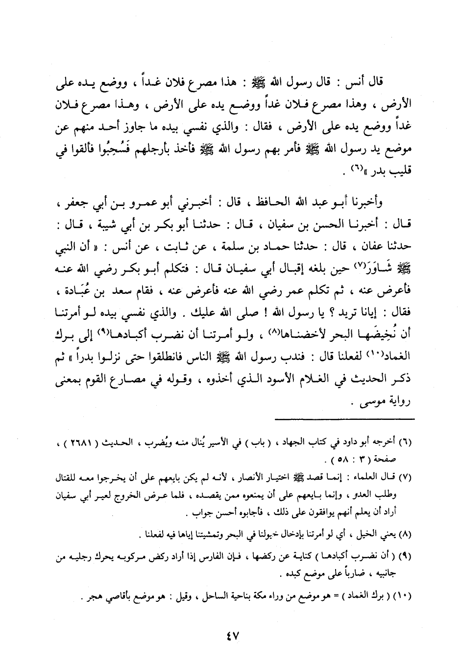 حَدَّثَنَا عَفَّانُ، قَالَ: حَدَّثَنَا حَمَّادُ بْنُ سَلَمَةَ، عَنْ ثَابِتٍ، عَنْ أَنَسٍ: «أَنَّ النَّبِيَّ صَلَّى اللَّه عَلَيْهِ وَسَلَّمَ شَاوَرَ [ (7) ] حِينَ بَلَغَهُ إِقْبَالُ أَبِي سُفْيَانَ قَالَ: فَتَكَلَّمَ أَبُو بَكْرٍ رَضِيَ اللهُ عَنْهُ فَأَعْرَضَ عَنْهُ، ثُمَّ تَكَلَّمَ عُمَرُ رَضِيَ اللهُ عَنْهُ فَأَعْرَضَ عَنْهُ، فَقَامَ سَعْدُ بْنُ عُبَادَةَ، فَقَالَ: إِيَّانَا تُرِيدُ؟ يَا رَسُولَ اللهِ! صَلَّى الله عَلَيْكَ. وَالَّذِي نَفْسِي بِيَدِهِ لَوْ أَمَرْتَنَا أَنْ نُخِيضَهَا الْبَحْرَ لَأَخَضْنَاهَا [ (8) ] ، وَلَوْ أَمَرْتَنَا أَنْ نَضْرِبَ أَكْبَادَهَا [ (9) ] إِلَى بَرْكِ الْغِمَادِ [ (10) ] لَفَعَلْنَا قَالَ: فَنَدَبَ رَسُولُ اللهِ صَلَّى اللَّه عَلَيْهِ وَسَلَّمَ النَّاسَ فَانْطَلَقُوا حَتَّى نَزَلُوا بَدْرًا» ثُمَّ ذَكَرَ الْحَدِيثَ فِي الْغُلَامِ الْأَسْوَدِ الَّذِي أَخَذُوهُ، وَقَوْلَهُ فِي مَصَارِعِ الْقَوْمِ بِمَعْنَى رِوَايَةِ مُوسَى.