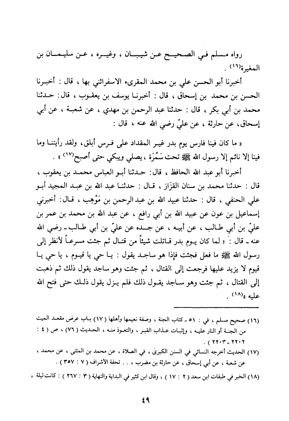 أَخْبَرَنَا أَبُو الْحَسَنِ عَلِيُّ بْنُ مُحَمَّدٍ الْمُقْرِئُ الْإِسْفَرَائِنِيُّ بِهَا، قَالَ: أَخْبَرَنَا الْحَسَنُ بْنُ مُحَمَّدِ بْنِ إِسْحَاقَ، قَالَ: أَخْبَرَنَا يُوسُفُ بْنُ يَعْقُوبَ، قَالَ: حَدَّثَنَا مُحَمَّدُ بْنُ أَبِي بَكْرٍ، قَالَ: حَدَّثَنَا عَبْدُ الرَّحْمَنِ بْنُ مَهْدِيٍّ، عَنْ شُعْبَةَ، عَنْ أَبِي إِسْحَاقَ، عَنْ حَارِثَةَ، عَنْ عَلِيٍّ رَضِيَ اللهُ عَنْهُ، قَالَ: «مَا كَانَ فِينَا فَارِسٌ يَوْمَ بَدْرٍ غَيْرَ الْمِقْدَادِ عَلَى فَرَسٍ أَبْلَقَ، وَلَقَدْ رَأَيْتُنَا وَمَا فِينَا إِلَّا نَائِمٌ إِلَّا رَسُولَ اللهِ صَلَّى اللَّه عَلَيْهِ وَسَلَّمَ تَحْتَ سَمُرَةٍ، يُصَلِّي وَيَبْكِي حَتَّى أَصْبَحَ [ (17) ] » .
