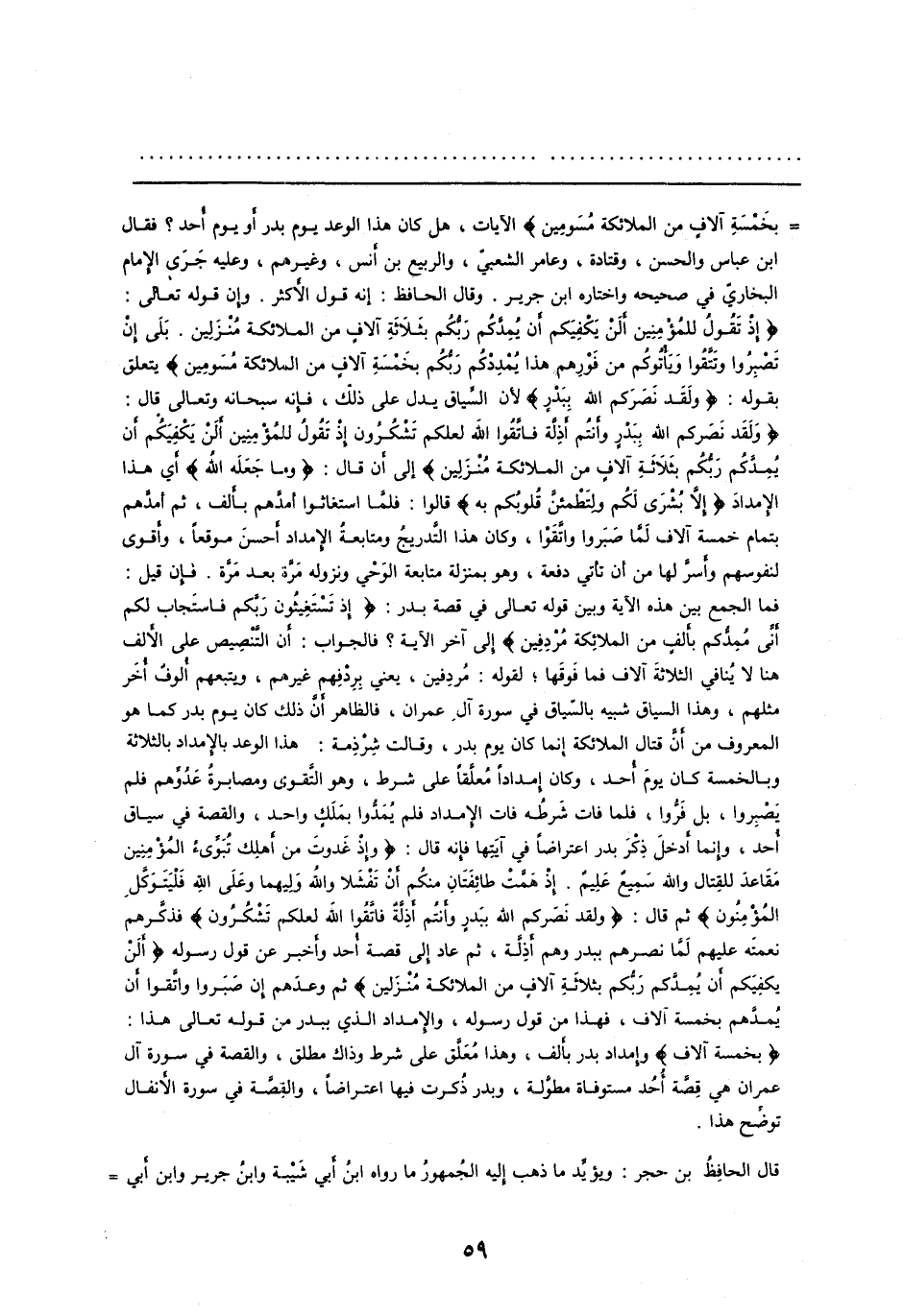 [ () ] بِخَمْسَةِ آلافٍ مِنَ الْمَلائِكَةِ مُسَوِّمِينَ الآيات، هل كان هذا الوعد يوم بدر أو يوم أحد؟ فقال ابن عباس والحسن، وقتادة، وعامر الشعبيّ، والربيع بن أنس، وغيرهم، وعليه جرى الإمام البخاريّ في صحيحه واختاره ابن جرير. وقال الحافظ: إنه قول الأكثر. وإن قوله تعالى: