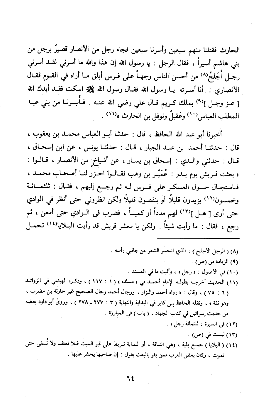 الْحَارِثِ فَقَتَلْنَا مِنْهُمْ سَبْعِينَ وَأَسَرْنَا سَبْعِينَ فَجَاءَ رَجُلٌ مِنَ الْأَنْصَارِ قَصِيرٌ بِرَجُلٍ مِنْ بَنِي هَاشِمٍ أَسِيرًا، فَقَالَ الرَّجُلُ: يَا رَسُولَ اللهِ إِنَّ هَذَا وَاللهِ مَا أَسَرَنِي لَقَدْ أَسَرَنِي رَجُلٌ أَجْلَحُ [ (8) ] مِنْ أَحْسَنِ النَّاسِ وَجْهًا عَلَى فَرَسٍ أَبْلَقَ مَا أَرَاهُ فِي الْقَوْمِ فَقَالَ الْأَنْصَارِيُّ: أَنَا أَسَرْتُهُ يَا رَسُولَ اللهِ فَقَالَ رَسُولُ اللهِ صَلَّى اللَّه عَلَيْهِ وَسَلَّمَ اسْكُتْ فَقَدَ أَيَّدَكَ اللهُ [عَزَّ وَجَلَّ] [ (9) ] بِمَلَكٍ كَرِيمٍ قَالَ عَلِيٌّ رَضِيَ اللهُ عَنْهُ. فَأُسِرْنَا مِنْ بَنِي عَبْدِ الْمُطَّلِبِ الْعَبَّاسُ [ (10) ] وَعَقِيلٌ وَنَوْفَلُ بْنُ الْحَارِثِ» [ (11) ] .