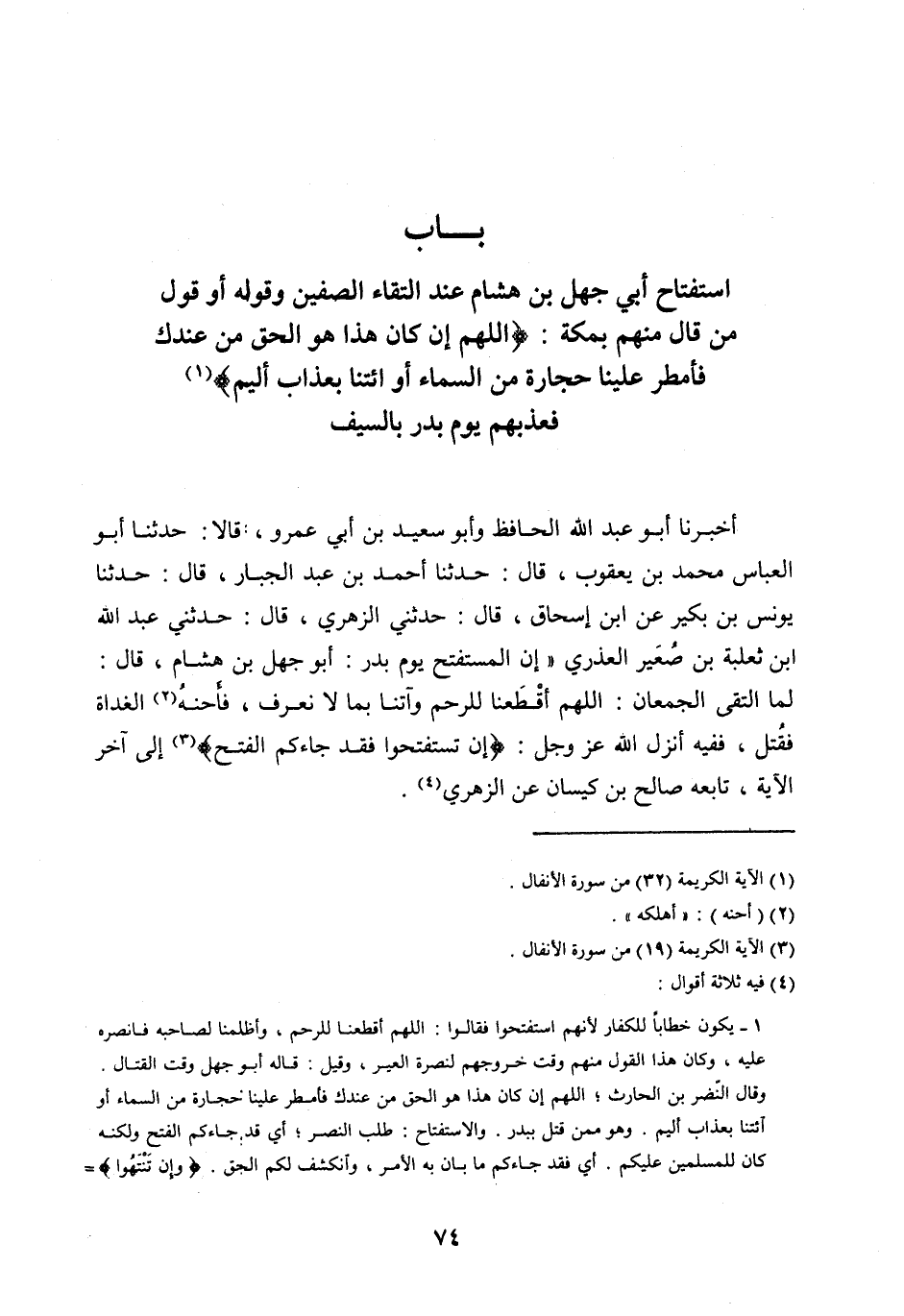 بَابُ اسْتِفْتَاحِ أَبِي جَهْلِ بْنِ هِشَامٍ عِنْدَ الْتِقَاءِ الصَّفَّيْنِ وَقَوْلِهِ أَوْ قَوْلِ مَنْ قَالَ مِنْهُمْ بِمَكَّةَ: اللَّهُمَّ إِنْ كانَ هَذَا هُوَ الْحَقَّ مِنْ عِنْدِكَ فَأَمْطِرْ عَلَيْنا حِجارَةً مِنَ السَّماءِ أَوِ ائْتِنا بِعَذابٍ أَلِيمٍ [ (1) ] فَعَذَّبَهُمْ يَوْمَ بَدْرٍ بِالسَّيْفِ
