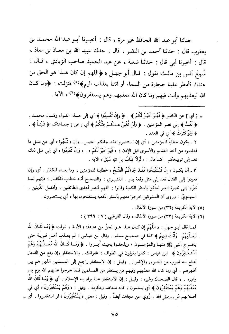 سَمِعَ أَنَسَ بْنَ مَالِكٍ يَقُولُ: قَالَ أَبُو جَهْلٍ «اللَّهُمَّ إِنْ كانَ هَذَا هُوَ الْحَقَّ مِنْ عِنْدِكَ فَأَمْطِرْ عَلَيْنا حِجارَةً مِنَ السَّماءِ أَوِ ائْتِنا بِعَذابٍ أَلِيمٍ [ (5) ] فَنَزَلَتْ: وَما كانَ اللَّهُ لِيُعَذِّبَهُمْ وَأَنْتَ فِيهِمْ وَما كانَ اللَّهُ مُعَذِّبَهُمْ وَهُمْ يَسْتَغْفِرُونَ [ (6) ] » الآية.