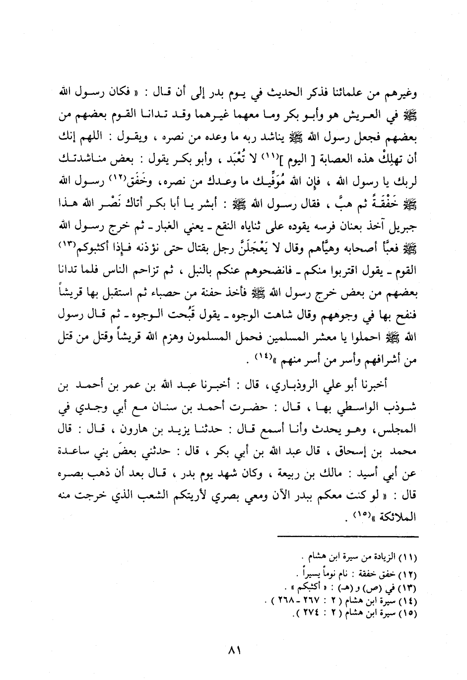وَغَيْرُهُمْ مِنْ عُلَمَائِنَا فَذَكَرَ الْحَدِيثَ فِي يَوْمِ بَدْرٍ إِلَى أَنْ قَالَ: «فَكَانَ رَسُولُ اللَّه صَلَّى اللَّه عَلَيْهِ وَسَلَّمَ فِي الْعَرِيشِ هُوَ وَأَبُو بَكْرٍ وَمَا معهما غيرهما وقد تدانا الْقَوْمُ بَعْضُهُمْ مِنْ بَعْضِهِمْ فَجَعَلَ رَسُولُ اللَّه صَلَّى اللَّه عَلَيْهِ وَسَلَّمَ يُنَاشِدُ رَبَّهُ مَا وَعَدَهُ مِنْ نَصْرِهِ، وَيَقُولُ: اللهُمَّ إِنَّكَ إِنْ تُهْلِكْ هَذِهِ الْعِصَابَةَ [الْيَوْمَ] [ (11) ] لَا تُعْبَدْ، وَأَبُو بَكْرٍ يَقُولُ: بَعْضَ مُنَاشَدَتِكَ لِرَبِّكَ يَا رَسُولَ اللَّه، فَإِنَّ اللَّه مُوفِيكَ مَا وَعَدَكَ مِنْ نَصْرِهِ، وَخَفَقَ [ (12) ] رسول اللَّه صلى اللَّه عَلَيْهِ وَسَلَّمَ خَفْقَةً ثُمَّ هَبَّ، فَقَالَ رَسُولُ اللَّه صَلَّى اللَّه عَلَيْهِ وَسَلَّمَ: أَبْشِرْ يَا أَبَا بَكْرٍ أَتَاكَ نَصْرُ اللَّه هَذَا جِبْرِيلُ آخِذٌ بِعِنَانِ فَرَسِهِ يَقُودُهُ عَلَى ثَنَايَاهُ النَّقْعُ- يَعْنِي الْغُبَارُ- ثُمَّ خَرَجَ رَسُولُ اللَّه صَلَّى اللَّه عَلَيْهِ وَسَلَّمَ فَعَبَّأَ أَصْحَابَهُ وَهَيَّأَهُمْ وَقَالَ لَا يَعْجَلَنَّ رَجُلٌ بِقِتَالٍ حَتَّى نُؤْذِنَهُ فَإِذَا أكثبوكم [ (13) ] القوم- يقول اقْتَرَبُوا مِنْكُمْ- فَانْضَحُوهُمْ عَنْكُمْ بِالنَّبْلِ، ثُمَّ تَزَاحَمَ النَّاسُ فَلَمَّا تَدَانَا بَعْضُهُمْ مِنْ بَعْضٍ خَرَجَ رَسُولُ اللَّه صَلَّى اللَّه عَلَيْهِ وَسَلَّمَ فَأَخَذَ حَفْنَةً مِنْ حَصْبَاءٍ ثُمَّ اسْتَقْبَلَ بِهَا قُرَيْشًا فَنَفَحَ بِهَا فِي وُجُوهِهِمْ وَقَالَ شَاهَتِ الْوُجُوهُ- يَقُولُ قَبُحَتِ الْوُجُوهُ- ثُمَّ قَالَ رَسُولُ اللَّه صَلَّى اللَّه عَلَيْهِ وَسَلَّمَ احْمِلُوا يَا مَعْشَرَ الْمُسْلِمِينَ فَحَمَلَ الْمُسْلِمُونَ وَهَزَمَ اللَّه قُرَيْشًا وَقُتِلَ مَنْ قُتِلَ مِنْ أَشْرَافِهِمْ وَأُسِرَ مَنْ أُسِرَ مِنْهُمْ» [ (14) ] .