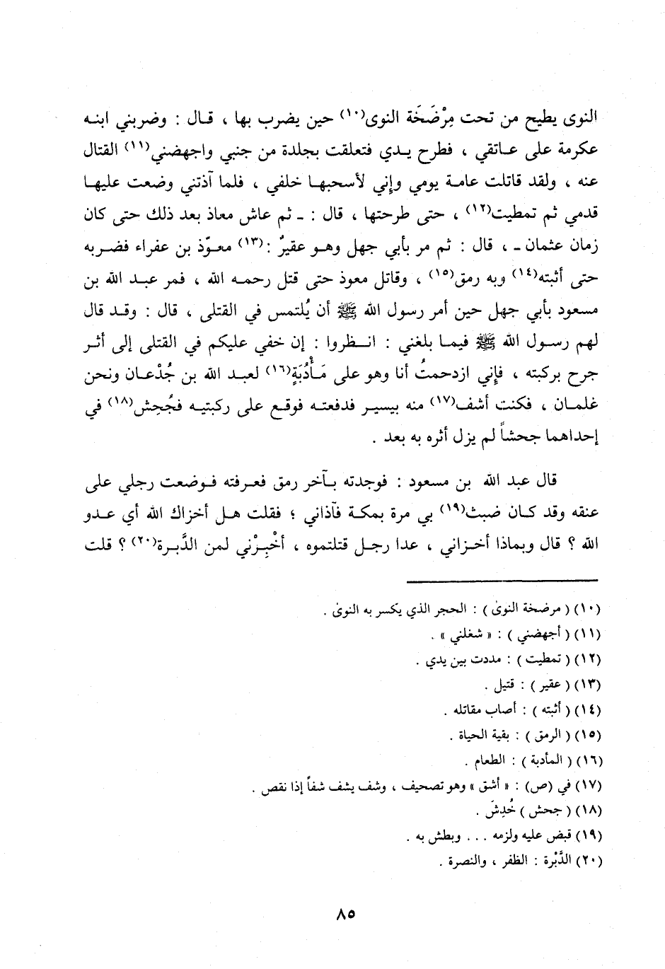 النَّوَى يَطِيحُ مِنْ تَحْتِ مِرْضَخَةِ النَّوَى [ (10) ] حِينَ يُضْرَبُ بِهَا، قَالَ: وَضَرَبَنِي ابْنُهُ عِكْرِمَةُ عَلَى عَاتِقِي، فَطَرَحَ يَدِي فَتَعَلَّقَتْ بِجِلْدَةٍ مِنْ جَنْبِي وَأَجْهَضَنِي [ (11) ] الْقِتَالُ عَنْهُ، وَلَقَدْ قَاتَلْتُ عَامَّةَ يَوْمِي وَإِنِّي لَأَسْحَبُهَا خَلْفِي، فَلَمَّا آذَتْنِي وَضَعْتُ عَلَيْهَا قَدَمِي ثُمَّ تَمَطَّيْتُ [ (12) ] ، حَتَّى طَرَحْتُهَا، قَالَ: - ثُمَّ عَاشَ مُعَاذٌ بَعْدَ ذَلِكَ حَتَّى كَانَ زَمَانُ عُثْمَانَ-، قَالَ: ثُمَّ مَرَّ بِأَبِي جَهْلٍ وَهُوَ عقير: [ (13) ] معوّذ بن عَفْرَاءَ فَضَرَبَهُ حَتَّى أَثْبَتَهُ [ (14) ] وَبِهِ رَمَقٌ [ (15) ] ، وَقَاتَلَ مُعَوِّذٌ حَتَّى قُتِلَ رَحِمَهُ اللَّه، فَمَرَّ عَبْدُ اللَّه بْنُ مَسْعُودٍ بِأَبِي جَهْلٍ حَينَ أَمَرَ رَسُولُ اللَّه صَلَّى اللَّه عليه وسلم أن يُلْتَمَسَ فِي الْقَتْلَى، قَالَ: