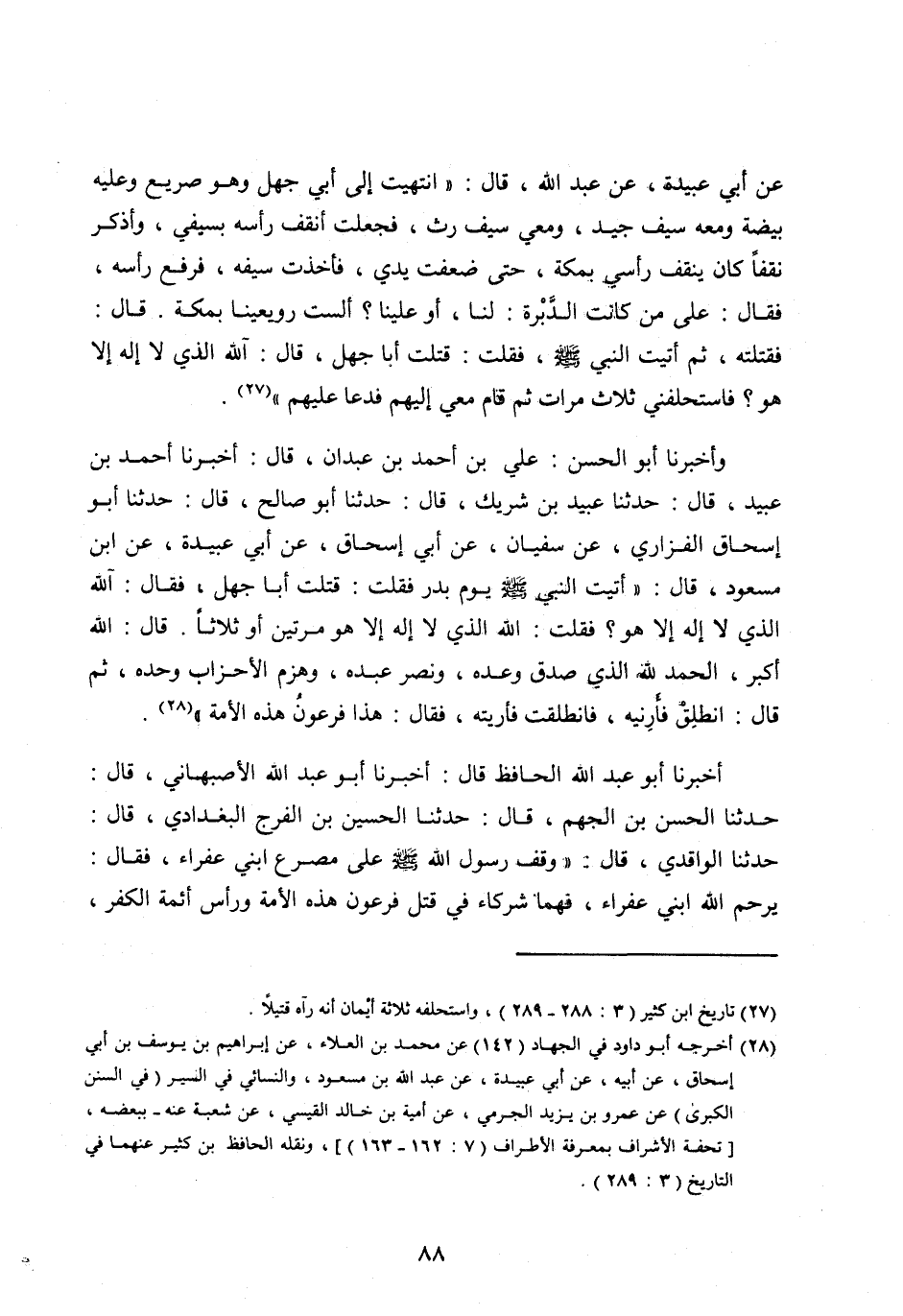 عَنْ أَبِي عُبَيْدَةَ، عَنْ عَبْدِ اللَّه، قَالَ: «انْتَهَيْتُ إِلَى أَبِي جَهْلٍ وَهُوَ صَرِيعٌ وَعَلَيْهِ بَيْضَةٌ وَمَعَهُ سَيْفٌ جَيِّدٌ، وَمَعِي سَيْفٌ رَثٌّ، فَجَعَلْتُ أَنْقُفُ رَأْسَهُ بِسَيْفِي، وَأَذْكُرُ نَقْفًا كَانَ يَنْقُفُ رَأْسِي بِمَكَّةَ، حَتَّى ضَعُفَتْ يَدَيَّ، فَأَخَذْتُ سَيْفَهُ، فَرَفَعَ رَأْسَهُ، فَقَالَ: عَلَى مَنْ كَانَتِ الدَّبْرَةُ: لَنَا، أَوْ عَلَيْنَا؟ أَلَسْتَ رُوَيْعِيَّنَا بِمَكَّةَ. قَالَ: