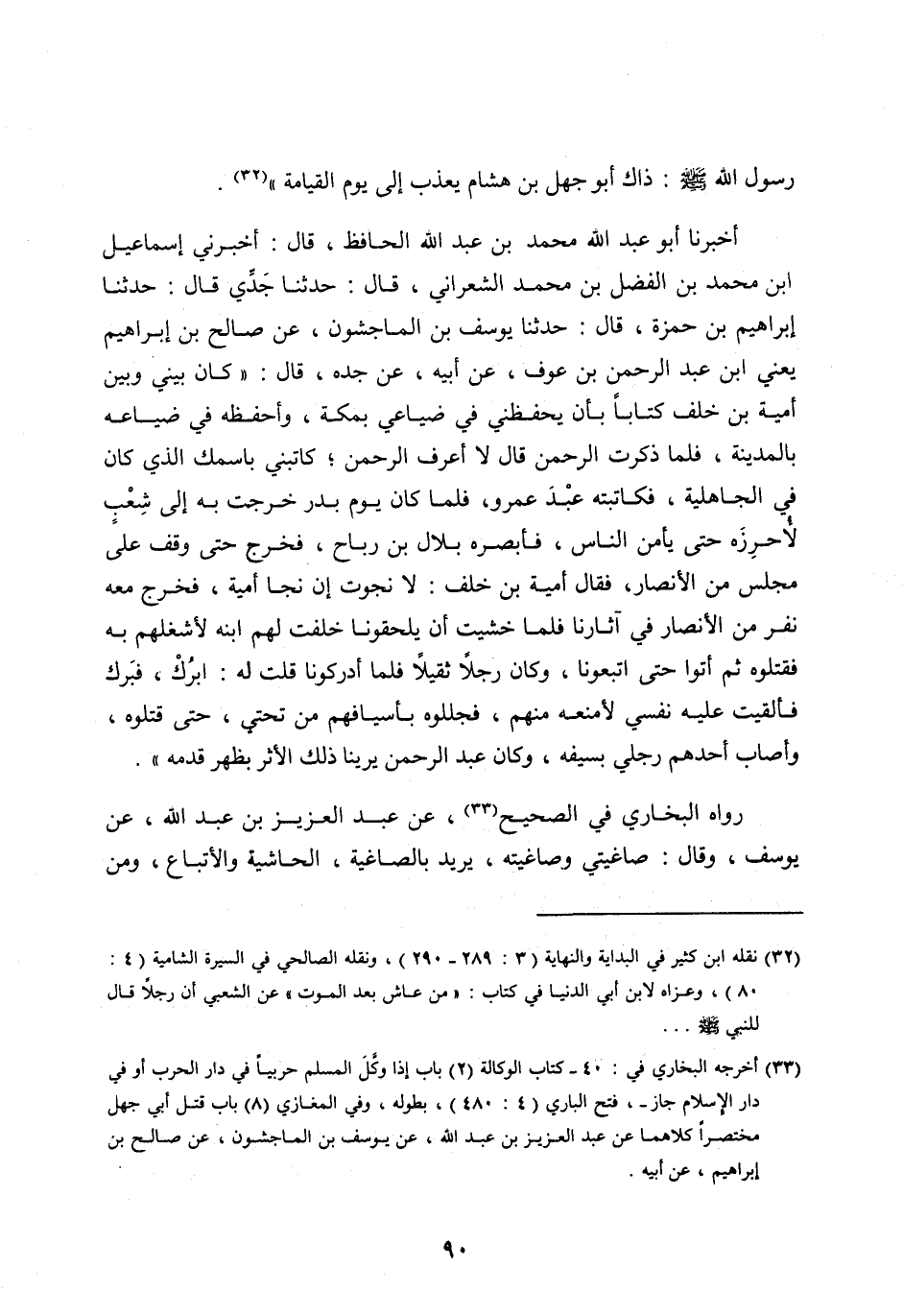 [ (33) ] أَخْرَجَهُ الْبُخَارِيُّ في: 40- كتاب الوكالة (2) باب إذا وكّل المسلم حربيا في دار الحرب أو في دار الإسلام جاز-، فتح الباري (4: 480) ، بطوله، وفي المغازي (8) باب قتل أبي جهل مختصرا كلاهما عَنْ عَبْدِ الْعَزِيزِ بْنِ عَبْدِ اللَّه، عَنْ يُوسُفُ بْنُ الْمَاجِشُونِ، عَنْ صَالِحِ بْنِ إِبْرَاهِيمَ، عَنْ أَبِيهِ.