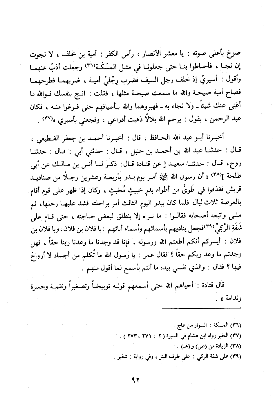 أَخْبَرَنَا أَبُو عَبْدِ اللَّه الْحَافِظُ، قَالَ: أَخْبَرَنَا أَحْمَدُ بْنُ جَعْفَرٍ الْقَطِيعِيُّ، قَالَ: حَدَّثَنَا عَبْدُ اللَّه بْنُ أَحْمَدَ بْنِ حَنْبَلٍ، قَالَ: حَدَّثَنِي أَبِي: قَالَ: حَدَّثَنَا رَوْحٌ، قَالَ: حَدَّثَنَا سَعِيدٌ [عَنْ قَتَادَةَ قَالَ: ذَكَرَ لَنَا أَنَسُ بْنُ مَالِكٍ عَنْ أَبِي طَلْحَةَ] [ (38) ] «أَنَّ رَسُولَ اللَّه صلى اللَّه عَلَيْهِ وَسَلَّمَ أَمَرَ يَوْمَ بَدْرٍ بِأَرْبَعَةٍ وَعِشْرِينَ رَجُلًا مِنْ صَنَادِيدِ قُرَيْشٍ فَقُذِفُوا فِي طَوِيٍّ مِنْ أَطْوَاءِ بَدْرٍ خَبِيثٍ مُخْبِثٍ، وَكَانَ إِذَا ظَهَرَ عَلَى قَوْمٍ أَقَامَ بِالْعَرْصَةِ ثَلَاثَ لَيَالٍ فَلَمَّا كَانَ بِبَدْرٍ الْيَوْمَ الثَّالِثَ أَمَرَ بِرَاحِلَتِهِ فَشُدَّ عَلَيْهَا رَحْلُهَا، ثُمَّ مَشَى وَاتَّبَعَهُ أَصْحَابُهُ فَقَالُوا: مَا نَرَاهُ إِلَّا يَنْطَلِقُ لِبَعْضِ حَاجَتِهِ، حَتَّى قَامَ عَلَى شَفَةِ الرَّكِيِّ [ (39) ] فَجَعَلَ يُنَادِيهِمْ بِأَسْمَائِهِمْ وَأَسْمَاءِ آبَائِهِمْ: يَا فُلَانُ بْنَ فُلَانٍ، وَيَا فُلَانُ بْنَ فُلَانٍ: أَيَسُرُّكُمْ أَنَّكُمْ أَطَعْتُمُ اللَّه وَرَسُولَهُ، فَإِنَّا قَدْ وَجَدْنَا مَا وَعَدَنَا رَبُّنَا حَقًّا، فَهَلْ وَجَدْتُمْ مَا وَعَدَ رَبُّكُمْ حَقًّا؟ فَقَالَ عُمَرُ: يَا رَسُولَ اللَّه مَا تُكَلِّمُ مِنْ أَجْسَادٍ لَا أَرْوَاحَ فِيهَا؟ فَقَالَ: وَالَّذِي نَفْسِي بِيَدِهِ مَا أَنْتُمْ بِأَسْمَعَ لِمَا أَقُولُ مِنْهُمْ.