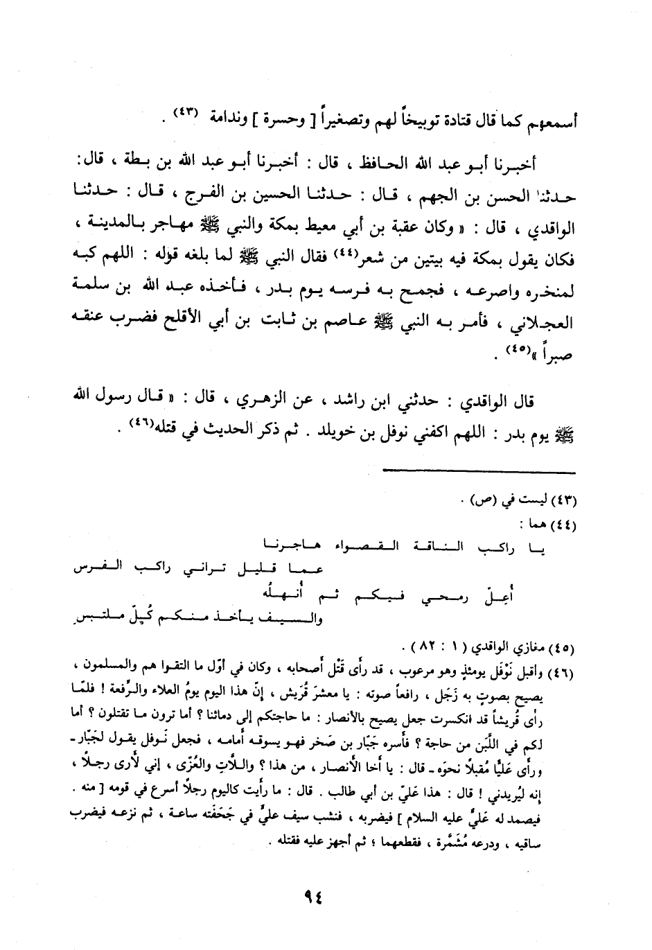 حَدَّثَنَا الْحَسَنُ بْنُ الْجَهْمِ، قَالَ: حَدَّثَنَا الْحُسَيْنُ بْنُ الْفَرَجِ، قَالَ: حَدَّثَنَا الْوَاقِدِيُّ، قَالَ: «وَكَانَ عُقْبَةَ بْنِ أَبِي مُعَيْطٍ بِمَكَّةَ وَالنَّبِيُّ صَلَّى اللَّه عَلَيْهِ وَسَلَّمَ مُهَاجِرٌ بِالْمَدِينَةِ، فَكَانَ يَقُولُ بِمَكَّةَ فِيهِ بَيْتَيْنِ مِنْ شِعْرٍ [ (44) ] فَقَالَ النَّبِيُّ صَلَّى اللَّه عَلَيْهِ وَسَلَّمَ لَمَّا بَلَغَهُ قَوْلُهُ: اللهُمَّ كُبَّهُ لِمَنْخَرِهِ واصْرَعْهُ، فَجَمَحَ بِهِ فَرَسُهُ يَوْمَ بَدْرٍ، فَأَخَذَهُ عَبْدُ اللَّه بْنُ سَلَمَةَ الْعَجْلَانِيُّ، فَأَمَرَ بِهِ النَّبِيُّ صَلَّى اللَّه عَلَيْهِ وَسَلَّمَ عَاصِمَ بْنَ ثَابِتِ بْنِ أَبِي الْأَقْلَحِ فَضَرَبَ عُنُقَهُ صَبْرًا»