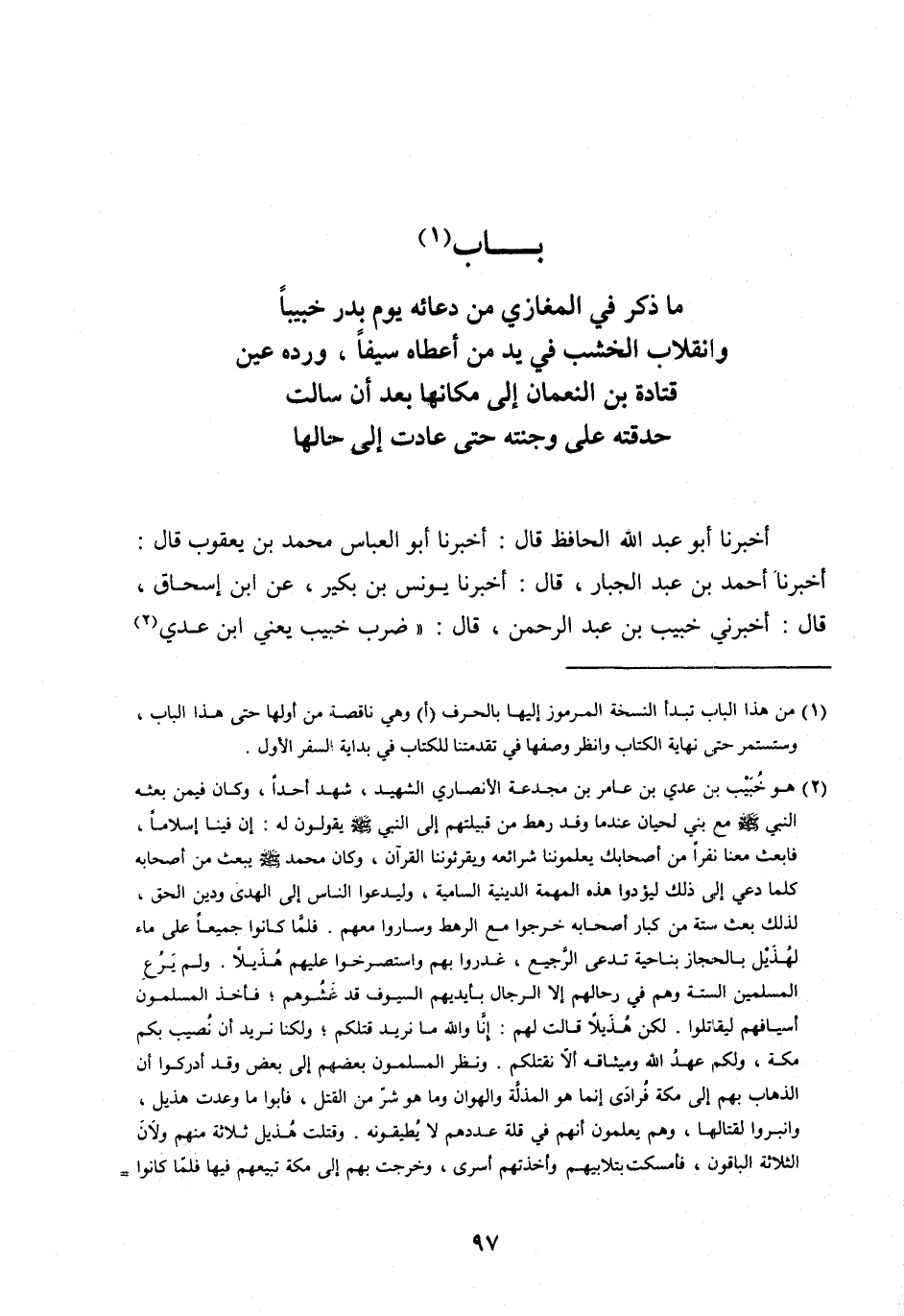 بَابُ [ (1) ] مَا ذُكِرَ فِي الْمَغَازِي مِنْ دُعَائِهِ يَوْمَ بَدْرٍ خُبَيْبًا وَانقِلَابِ الْخَشَبِ فِي يَدِ مَنْ أَعْطَاهُ سَيْفًا، وَرَدِّهِ عَيْنَ قَتَادَةَ بْنِ النُّعْمَانِ إِلَى مَكَانِهَا بَعْدَ أَنْ سَالَتْ حَدَقَتُهُ عَلَى وَجْنَتِهِ حَتَّى عَادَتْ إِلَى حَالِهَا