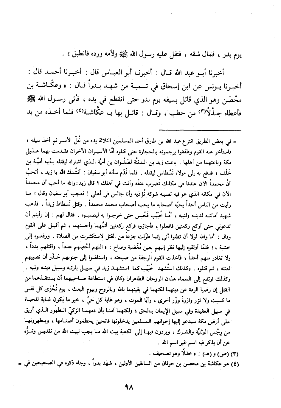 أَخْبَرَنَا يُونُسُ عَنِ ابْنِ إِسْحَاقَ فِي تَسْمِيَةِ مَنْ شَهِدَ بَدْرًا قَالَ: «وَعُكَّاشَةُ بْنُ مِحْصَنٍ وَهُوَ الَّذِي قَاتَلَ بِسَيْفِهِ يَوْمَ بَدْرٍ حَتَّى انْقَطَعَ فِي يَدِهِ، فَأَتَى رَسُولَ اللَّه صَلَّى اللَّه عَلَيْهِ وَسَلَّمَ فَأَعْطَاهُ جِذْلًا [ (3) ] مِنْ حَطَبٍ، وَقَالَ: قَاتِلْ بِهَا يَا عُكَّاشَةُ