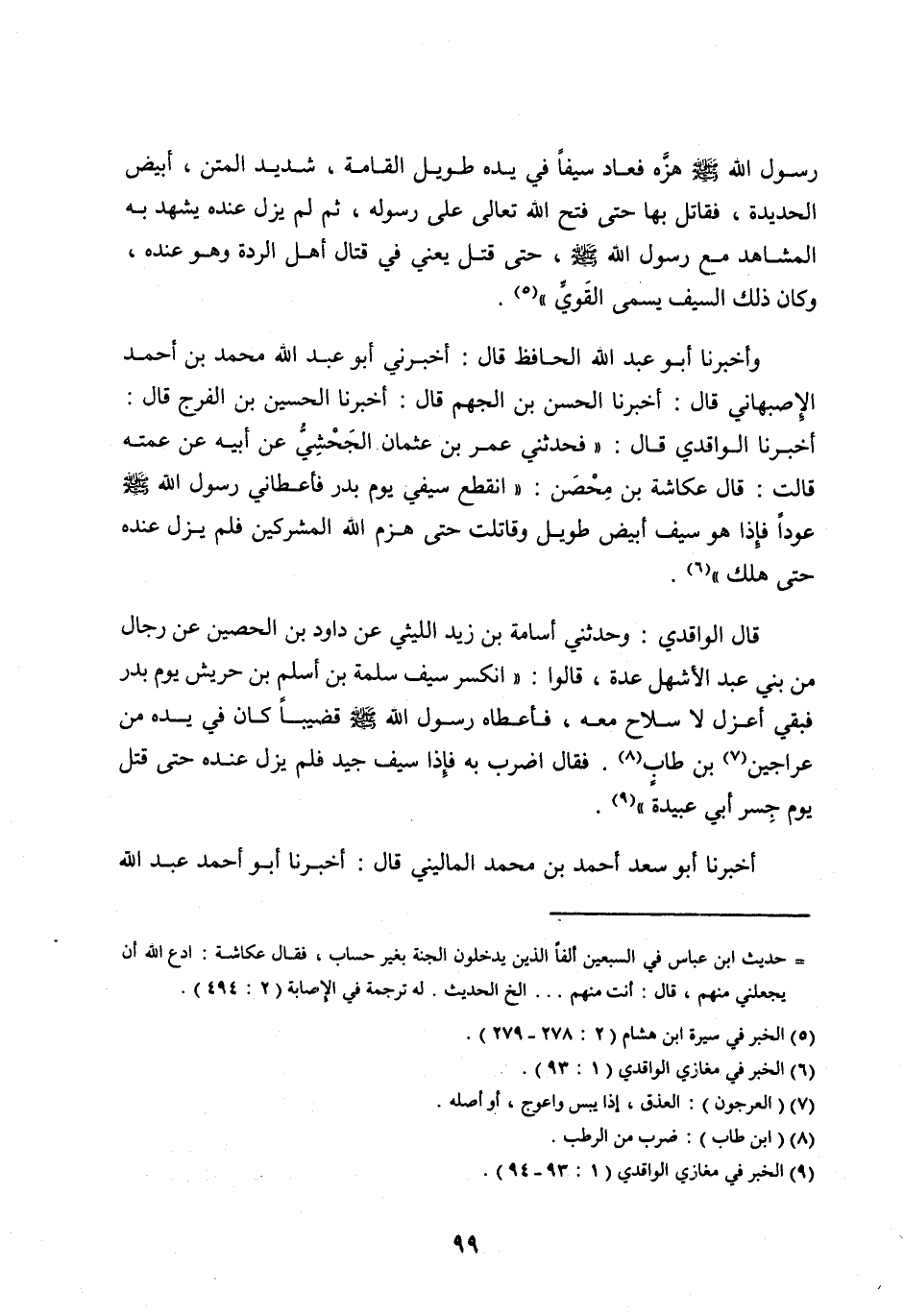 أَخْبَرَنَا الْوَاقِدِيُّ قَالَ: «فَحَدَّثَنِي عُمَرُ بْنُ عُثْمَانَ الْجَحْشِيُّ عَنْ أَبِيهِ عَنْ عَمَّتِهِ قَالَتْ: قَالَ عُكَّاشَةُ بْنُ مِحْصَنٍ: «انْقَطَعَ سَيْفِي يَوْمَ بَدْرٍ فَأَعْطَانِي رَسُولُ اللَّه صَلَّى اللَّه عَلَيْهِ وَسَلَّمَ عُودًا فَإِذَا هُوَ سَيْفٌ أَبْيَضُ طَوِيلٌ وَقَاتَلْتُ حَتَّى هَزَمَ اللَّه الْمُشْرِكِينَ فَلَمْ يَزَلْ عِنْدَهُ حَتَّى هَلَكَ» [ (6) ] .