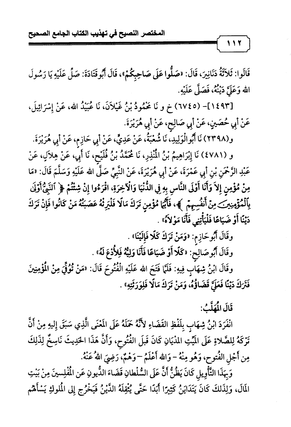 وقَالَ ابْنُ شِهَابٍ فِيهِ: فَلَمَّا فَتَحَ الله عَلَيْهِ الْفُتُوحَ قَالَ: «مَنْ تُوُفِّيَ مِنْ الْمُؤْمِنِينَ فَتَرَكَ دَيْنًا فَعَلَيَّ قَضَاؤُهُ، وَمَنْ تَرَكَ مَالًا فَلِوَرَثَتِهِ».