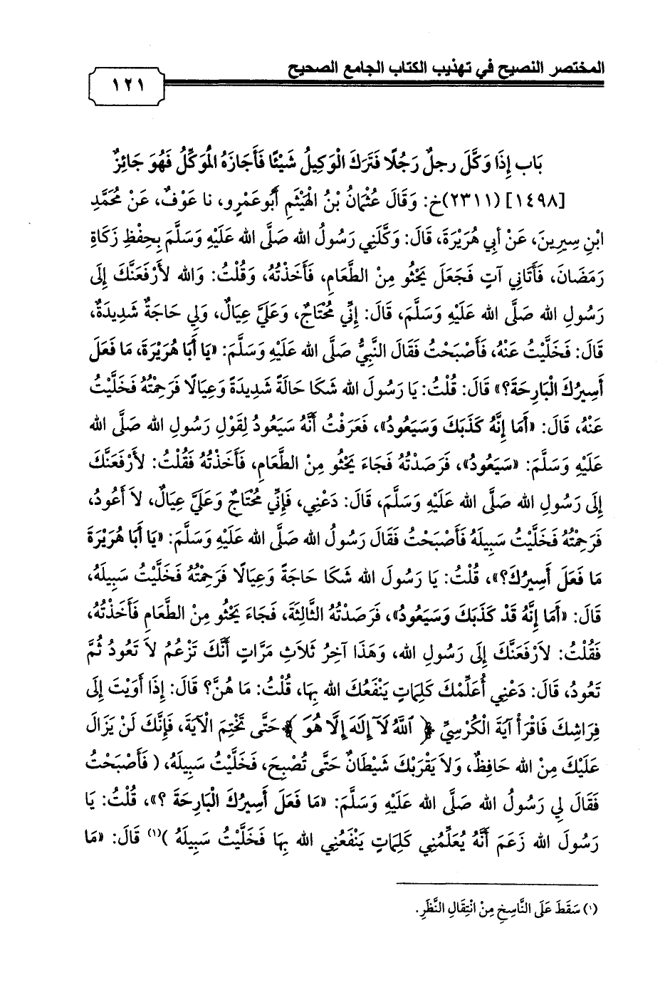 [1498] (2311) خ: وَقَالَ عُثْمَانُ بْنُ الْهَيْثَمِ أَبُوعَمْرٍو، نا عَوْفٌ، عَنْ مُحَمَّدِ بْنِ سِيرِينَ، عَنْ أبِي هُرَيْرَةَ، قَالَ: وَكَّلَنِي رَسُولُ الله صَلَّى الله عَلَيْهِ وَسَلَّمَ بِحِفْظِ زَكَاةِ رَمَضَانَ، فَأَتَانِي آتٍ فَجَعَلَ يَحْثُو مِنْ الطَّعَامِ، فَأَخَذْتُهُ، وَقُلْتُ: وَالله لأَرْفَعَنَّكَ إِلَى رَسُولِ الله صَلَّى الله عَلَيْهِ وَسَلَّمَ، قَالَ: إِنِّي مُحْتَاجٌ، وَعَلَيَّ عِيَالٌ، وَلِي حَاجَةٌ شَدِيدَةٌ، قَالَ: فَخَلَّيْتُ عَنْهُ، فَأَصْبَحْتُ فَقَالَ النَّبِيُّ صَلَّى الله عَلَيْهِ وَسَلَّمَ: «يَا أَبَا هُرَيْرَةَ، مَا فَعَلَ أَسِيرُكَ الْبَارِحَةَ؟» قَالَ: قُلْتُ: يَا رَسُولَ الله شَكَا حَالَةً شَدِيدَةً وَعِيَالًا فَرَحِمْتُهُ فَخَلَّيْتُ عَنْهُ، قَالَ: «أَمَا إِنَّهُ كَذَبَكَ وَسَيَعُودُ»، فَعَرَفْتُ أَنَّهُ سَيَعُودُ لِقَوْلِ رَسُولِ الله صَلَّى الله عَلَيْهِ وَسَلَّمَ: «سَيَعُودُ» , فَرَصَدْتُهُ فَجَاءَ يَحْثُو مِنْ الطَّعَامِ، فَأَخَذْتُهُ فَقُلْتُ: لأَرْفَعَنَّكَ إِلَى رَسُولِ الله صَلَّى الله عَلَيْهِ وَسَلَّمَ، قَالَ: دَعْنِي، فَإِنِّي مُحْتَاجٌ وَعَلَيَّ عِيَالٌ، لاَ أَعُودُ، فَرَحِمْتُهُ فَخَلَّيْتُ سَبِيلَهُ فَأَصْبَحْتُ فَقَالَ رَسُولُ الله صَلَّى الله عَلَيْهِ وَسَلَّمَ: «يَا أَبَا هُرَيْرَةَ مَا فَعَلَ أَسِيرُكَ؟»، قُلْتُ: يَا رَسُولَ الله شَكَا حَاجَةً وَعِيَالًا فَرَحِمْتُهُ فَخَلَّيْتُ سَبِيلَهُ، قَالَ: «أَمَا إِنَّهُ قَدْ كَذَبَكَ وَسَيَعُودُ»، فَرَصَدْتُهُ الثَّالِثَةَ, فَجَاءَ يَحْثُو مِنْ الطَّعَامِ فَأَخَذْتُهُ، فَقُلْتُ: لاَرْفَعَنَّكَ إِلَى رَسُولِ الله، وَهَذَا آخِرُ ثَلاَثِ مَرَّاتٍ أَنَّكَ تَزْعُمُ لاَ تَعُودُ ثُمَّ تَعُودُ، قَالَ: دَعْنِي أُعَلِّمْكَ كَلِمَاتٍ يَنْفَعُكَ الله بِهَا، قُلْتُ: مَا هُنَّ؟ قَالَ: إِذَا أَوَيْتَ إِلَى فِرَاشِكَ فَاقْرَأْ آيَةَ الْكُرْسِيِّ {اللَّهُ لَا إِلَهَ إِلَّا هُوَ} حَتَّى تَخْتِمَ الْآيَةَ، فَإِنَّكَ لَنْ يَزَالَ عَلَيْكَ مِنْ الله حَافِظٌ، وَلاَ يَقْرَبْكَ شَيْطَانٌ حَتَّى تُصْبِحَ، فَخَلَّيْتُ سَبِيلَهُ، (فَأَصْبَحْتُ فَقَالَ لِي رَسُولُ الله صَلَّى الله عَلَيْهِ وَسَلَّمَ: «مَا فَعَلَ أَسِيرُكَ الْبَارِحَةَ؟» , قُلْتُ: يَا رَسُولَ الله زَعَمَ أَنَّهُ يُعَلِّمُنِي كَلِمَاتٍ يَنْفَعُنِي الله بِهَا فَخَلَّيْتُ سَبِيلَهُ) (¬1) قَالَ: «مَا