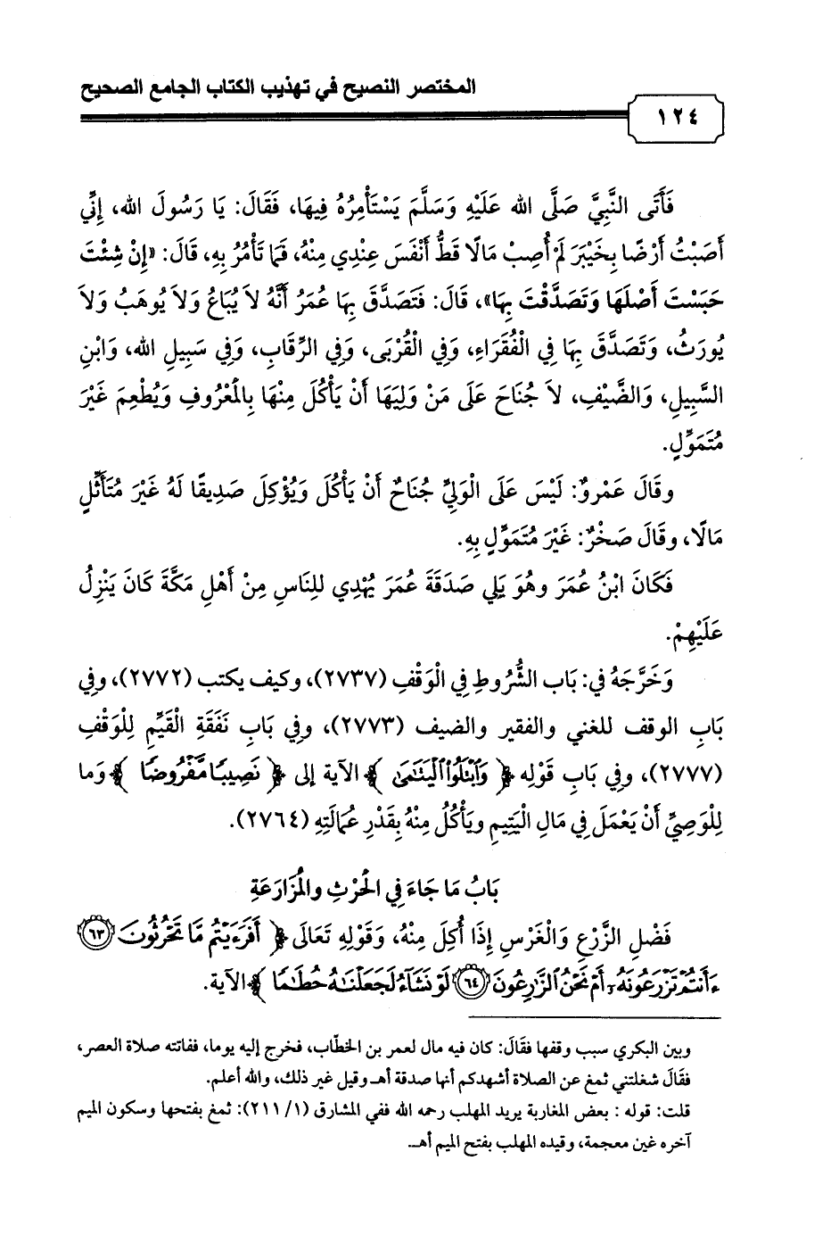 فَأَتَى النَّبِيَّ صَلَّى الله عَلَيْهِ وَسَلَّمَ يَسْتَأْمِرُهُ فِيهَا، فَقَالَ: يَا رَسُولَ الله، إِنِّي أَصَبْتُ أَرْضًا بِخَيْبَرَ لَمْ أُصِبْ مَالًا قَطُّ أَنْفَسَ عِنْدِي مِنْهُ، فَمَا تَأْمُرُ بِهِ، قَالَ: «إِنْ شِئْتَ حَبَسْتَ أَصْلَهَا وَتَصَدَّقْتَ بِهَا»، قَالَ: فَتَصَدَّقَ بِهَا عُمَرُ أَنَّهُ لاَ يُبَاعُ وَلاَ يُوهَبُ وَلاَ يُورَثُ، وَتَصَدَّقَ بِهَا فِي الْفُقَرَاءِ، وَفِي الْقُرْبَى، وَفِي الرِّقَابِ، وَفِي سَبِيلِ الله، وَابْنِ السَّبِيلِ، وَالضَّيْفِ، لاَ جُنَاحَ عَلَى مَنْ وَلِيَهَا أَنْ يَأْكُلَ مِنْهَا بِالْمَعْرُوفِ وَيُطْعِمَ غَيْرَ مُتَمَوِّلٍ.