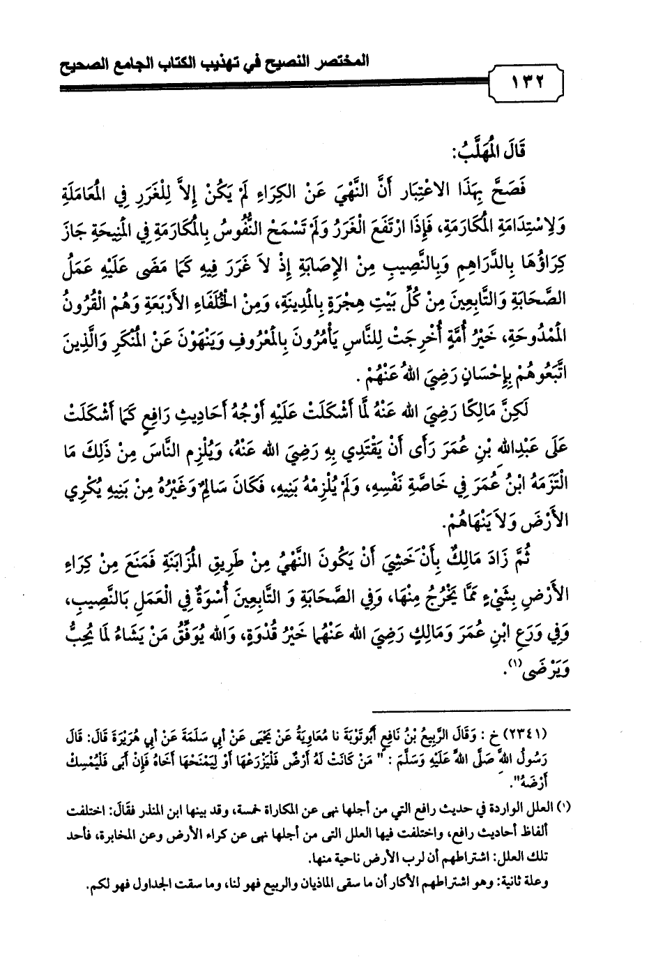 ثُمَّ زَادَ مَالِكٌ بِأَنْ َخَشِيَ أَنْ يَكُونَ النَّهْيُ مِنْ طَرِيقِ الْمُزَابَنَةِ فَمَنَعَ مِنْ كِرَاءِ الأَرْضِ بِشَيْءٍ مَمَّا يَخْرُجُ مِنْهَا، وَفِي الصَّحَابَةِ وَالتَّابِعِينَ أُِسْوَةٌ فِي الْعَمَلِ بَالنَّصِيبِ، وَفِي وَرَعِ ابْنِ عُمَرَ وَمَالِكٍ رَضِيَ الله عَنْهُما خَيْرُ قُدْوَةٍ, وَالله يُوَفِّقُ مَنْ يَشَاءُ لَمَا يُحِبُّ وَيَرْضَى (¬1).