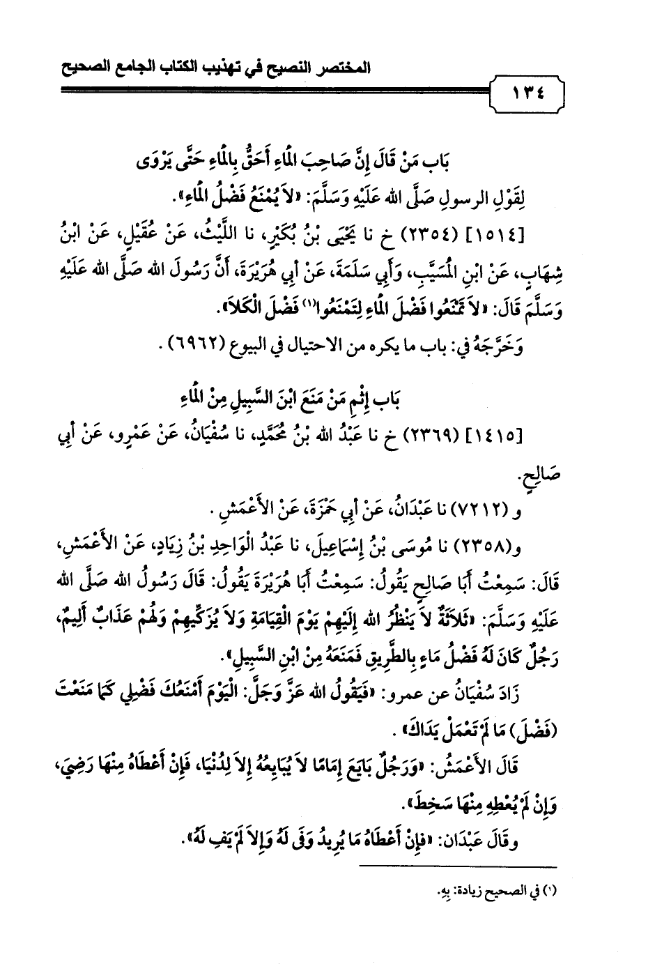 و (2358) نا مُوسَى بْنُ إِسْمَاعِيلَ، نا عَبْدُ الْوَاحِدِ بْنُ زِيَادٍ، عَنْ الأَعْمَشِ، قَالَ: سَمِعْتُ أَبَا صَالِحٍ يَقُولُ: سَمِعْتُ أَبَا هُرَيْرَةَ يَقُولُ: قَالَ رَسُولُ الله صَلَّى الله عَلَيْهِ وَسَلَّمَ: «ثَلاَثَةٌ لاَ يَنْظُرُ الله إِلَيْهِمْ يَوْمَ الْقِيَامَةِ وَلاَ يُزَكِّيهِمْ وَلَهُمْ عَذَابٌ أَلِيمٌ، رَجُلٌ كَانَ لَهُ فَضْلُ مَاءٍ بِالطَّرِيقِ فَمَنَعَهُ مِنْ ابْنِ السَّبِيلِ».