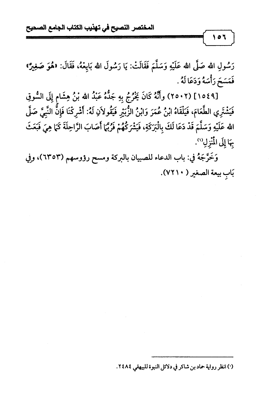 وَخَرَّجَهُ في: باب الدعاء للصبيان بالبركة ومسح رؤوسهم (6353) , وفِي بَابِ بيعة الصغير (7210).