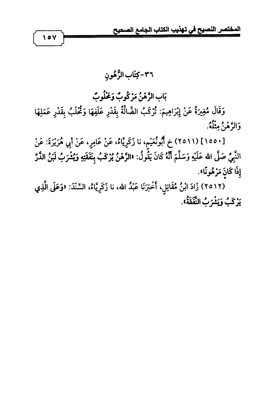 [1550] (2511) خ أَبُونُعَيْمٍ، نا زَكَرِيَّاءُ، عَنْ عَامِرٍ، عَنْ أبِي هُرَيْرَةَ: عَنْ النَّبِيِّ صَلَّى الله عَلَيْهِ وَسَلَّمَ أَنَّهُ كَانَ يَقُولُ: «الرَّهْنُ يُرْكَبُ بِنَفَقَتِهِ وَيُشْرَبُ لَبَنُ الدَّرِّ إِذَا كَانَ مَرْهُونًا».