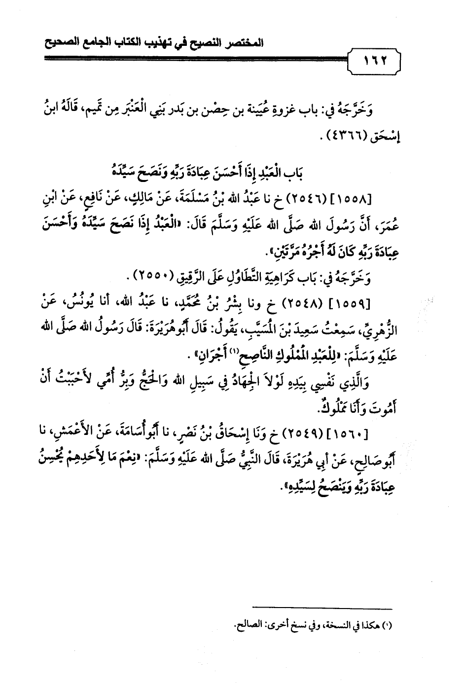 [1560] (2549) خ وَنَا إِسْحَاقُ بْنُ نَصْرٍ، نا أَبُوأُسَامَةَ، عَنْ الأَعْمَشِ، نا أَبُوصَالِحٍ، عَنْ أبِي هُرَيْرَةَ، قَالَ النَّبِيُّ صَلَّى الله عَلَيْهِ وَسَلَّمَ: «نِعْمَ مَا لِأَحَدِهِمْ يُحْسِنُ عِبَادَةَ رَبِّهِ وَيَنْصَحُ لِسَيِّدِهِ».