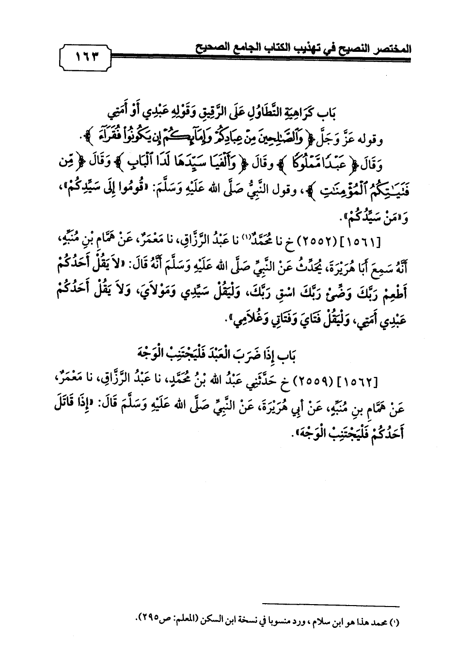[1562] (2559) خ حَدَّثَنِي عَبْدُ الله بْنُ مُحَمَّدٍ، نا عَبْدُ الرَّزَّاقِ، نا مَعْمَرٌ، عَنْ هَمَّامِ بنِ مُنَبِّهٍ، عَنْ أبِي هُرَيْرَةَ، عَنْ النَّبِيِّ صَلَّى الله عَلَيْهِ وَسَلَّمَ قَالَ: «إِذَا قَاتَلَ أَحَدُكُمْ فَلْيَجْتَنِبْ الْوَجْهَ».