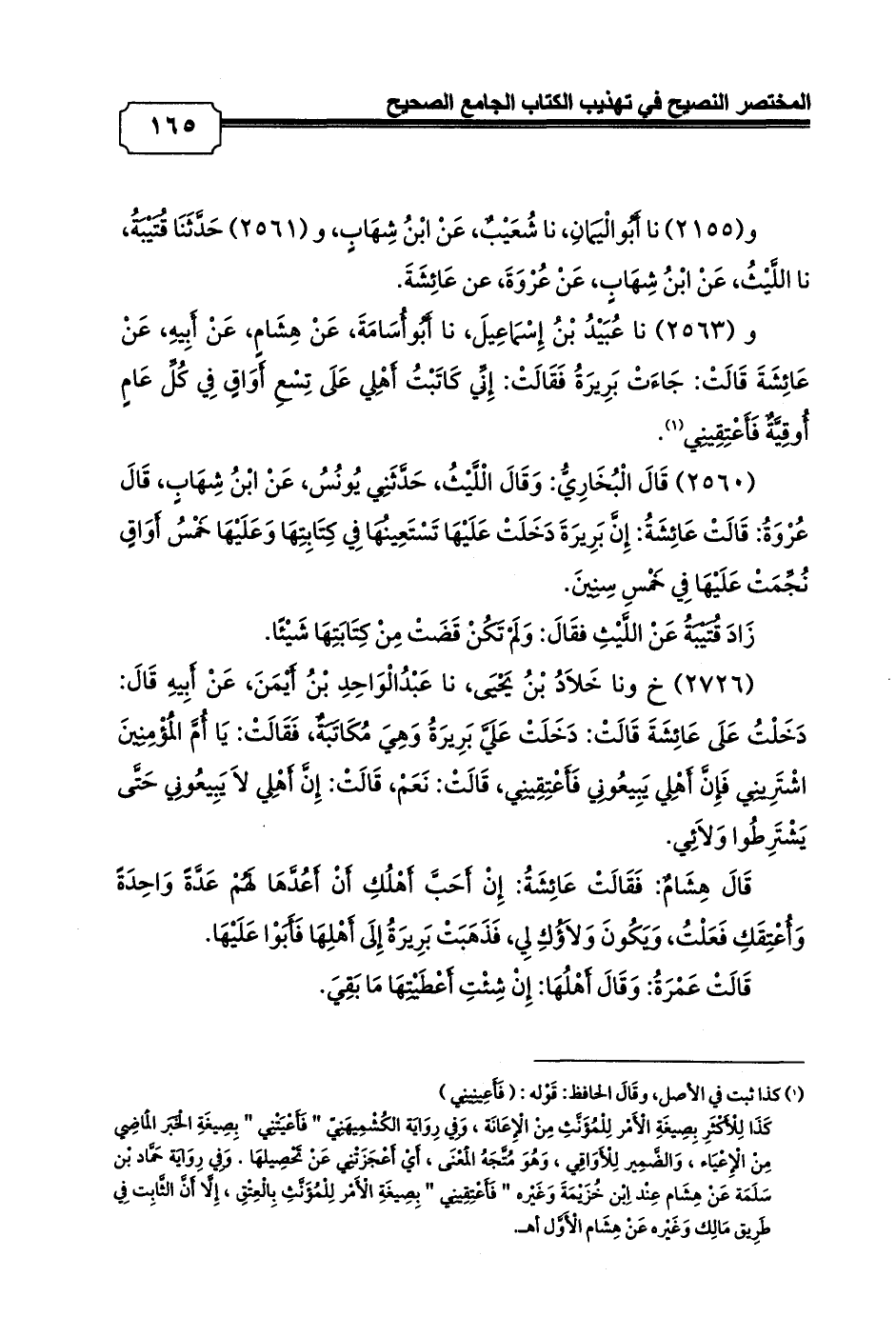 و (2563) نا عُبَيْدُ بْنُ إِسْمَاعِيلَ، نا أَبُوأُسَامَةَ، عَنْ هِشَامٍ، عَنْ أَبِيهِ، عَنْ عَائِشَةَ قَالَتْ: جَاءَتْ بَرِيرَةُ فَقَالَتْ: إِنِّي كَاتَبْتُ أَهْلِي عَلَى تِسْعِ أَوَاقٍ فِي كُلِّ عَامٍ أُوقِيَّةٌ فَأَعْتِقِينِي (¬1).