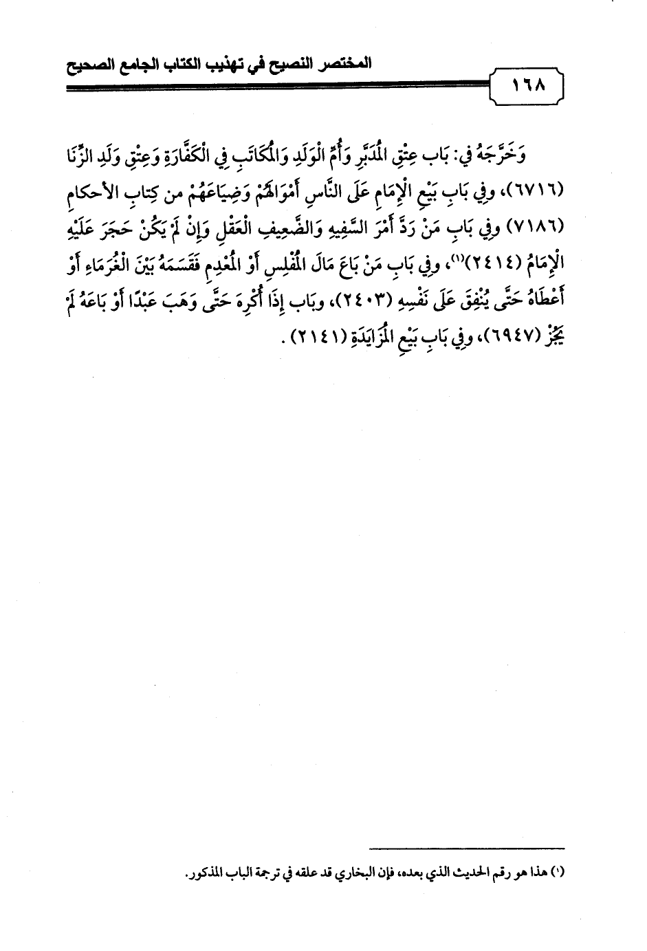 وَخَرَّجَهُ في: بَاب عِتْقِ الْمُدَبَّرِ وَأُمِّ الْوَلَدِ وَالْمُكَاتَبِ فِي الْكَفَّارَةِ وَعِتْقِ وَلَدِ الزِّنَا (6716) , وفِي بَابِ بَيْعِ الْإِمَامِ عَلَى النَّاسِ أَمْوَالَهُمْ وَضِيَاعَهُمْ من كِتابِ الأحكامِ (7186) وفِي بَابِ مَنْ رَدَّ أَمْرَ السَّفِيهِ وَالضَّعِيفِ الْعَقْلِ وَإِنْ لَمْ يَكُنْ حَجَرَ عَلَيْهِ الْإِمَامُ (2414) (¬1) , وفِي بَابِ مَنْ بَاعَ مَالَ الْمُفْلِسِ أَوْ الْمُعْدِمِ فَقَسَمَهُ بَيْنَ الْغُرَمَاءِ أَوْ أَعْطَاهُ حَتَّى يُنْفِقَ عَلَى نَفْسِهِ (2403) , وبَاب إِذَا أُكْرِهَ حَتَّى وَهَبَ عَبْدًا أَوْ بَاعَهُ لَمْ يَجُزْ (6947) , وفِي بَابِ بَيْعِ الْمُزَايَدَةِ (2141).