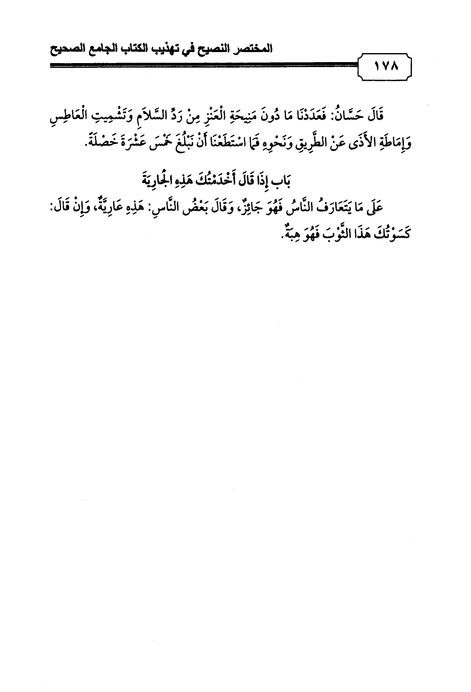 قَالَ حَسَّانُ: فَعَدَدْنَا مَا دُونَ مَنِيحَةِ الْعَنْزِ مِنْ رَدِّ السَّلاَمِ وَتَشْمِيتِ الْعَاطِسِ وَإِمَاطَةِ الأَذَى عَنْ الطَّرِيقِ وَنَحْوِهِ فَمَا اسْتَطَعْنَا أَنْ نَبْلُغَ خَمْسَ عَشْرَةَ خَصْلَةً.